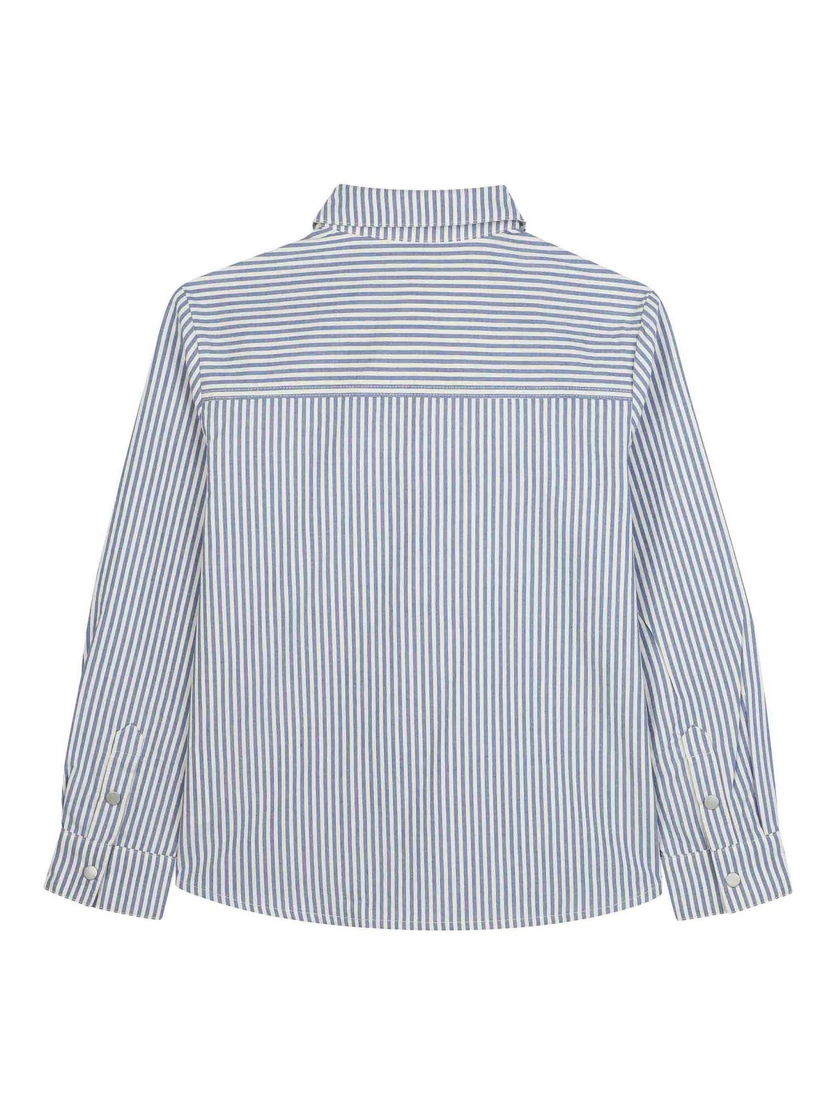 青と白のボタン付き、胸ポケット2つ、ロゴ刺繍、長袖