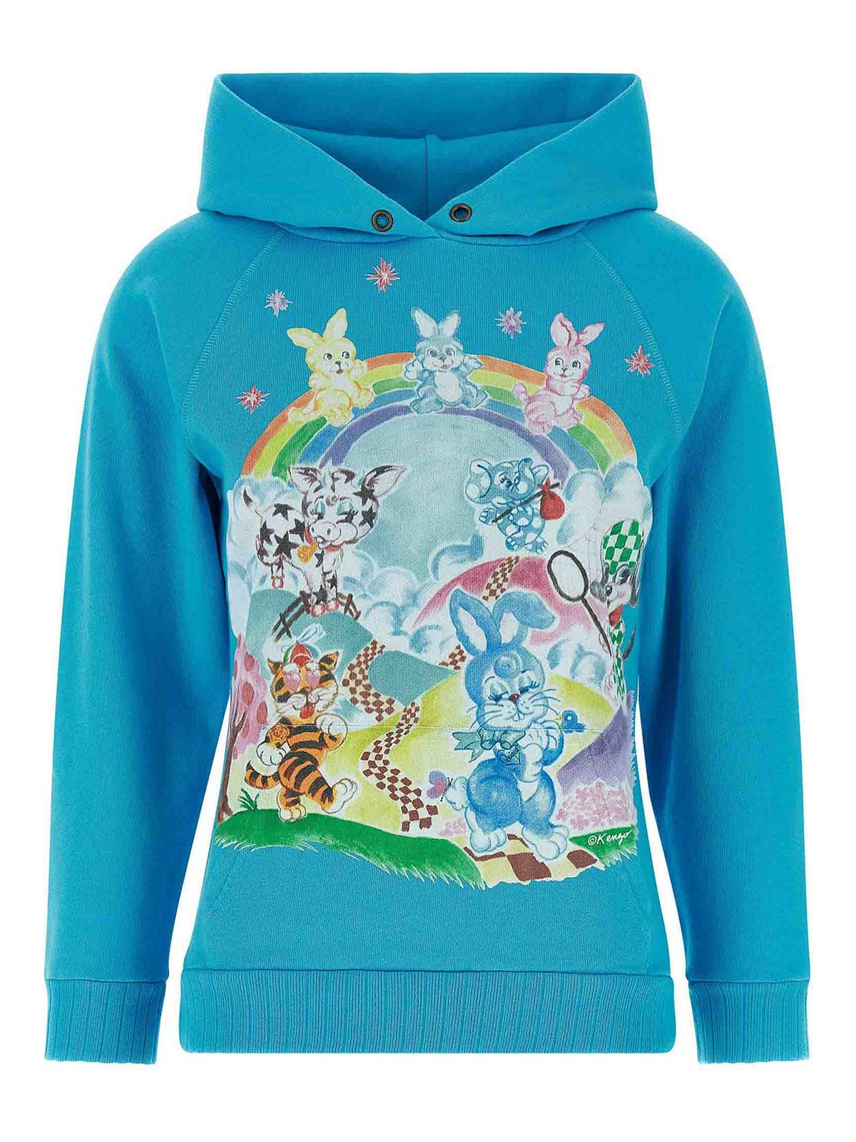 コットンテリーの裏地、トーンオントーンのストレッチリブ編みの裾と袖口、先のとがったフード、フロントグラフィックプリント、カンガルーポケット、カフ付きロングスリーブ、ヘッドバンドが付いたケンゾーカートゥーンのコットンパーカー。