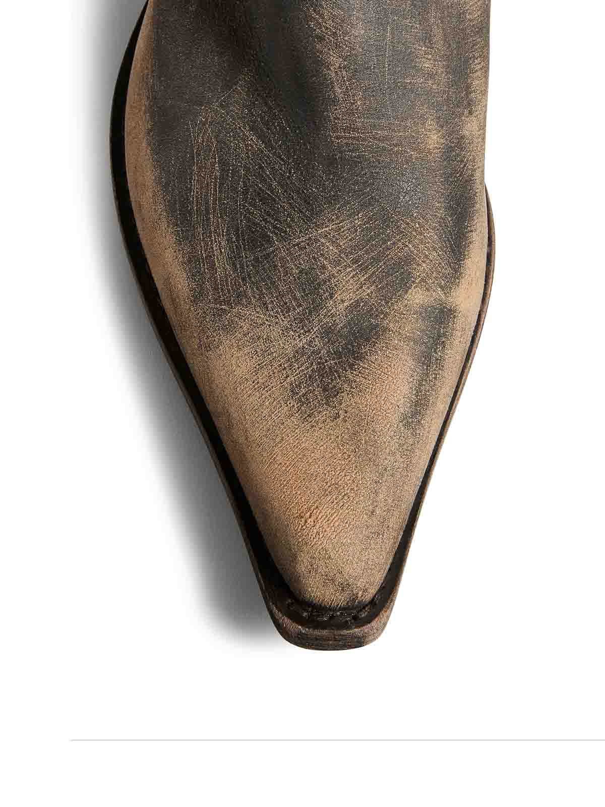 つま先を切り詰めたシルエット、意図的に傾斜のあるシャフト、植物製、なめし、手作り、ブラッシュ加工による豊かな緑青仕上げ、ステッチウェルト、ラミネート、ブラック/ブラウン