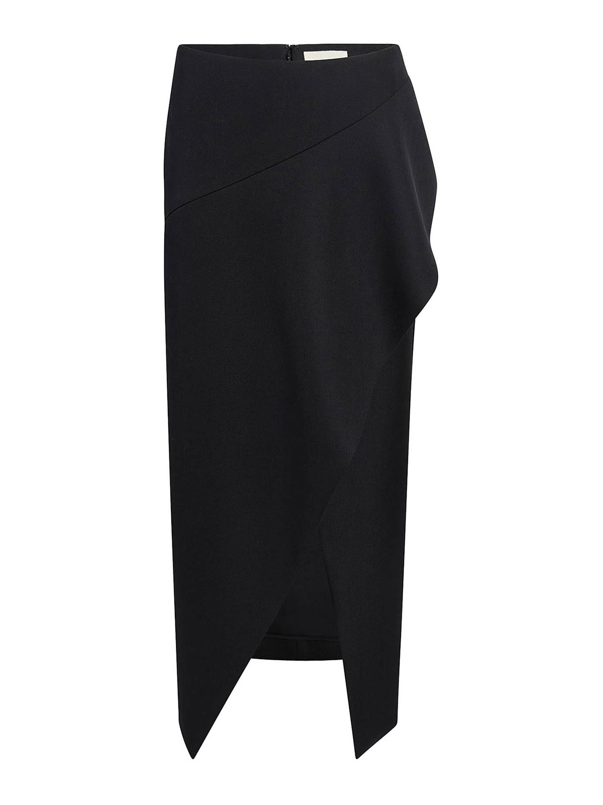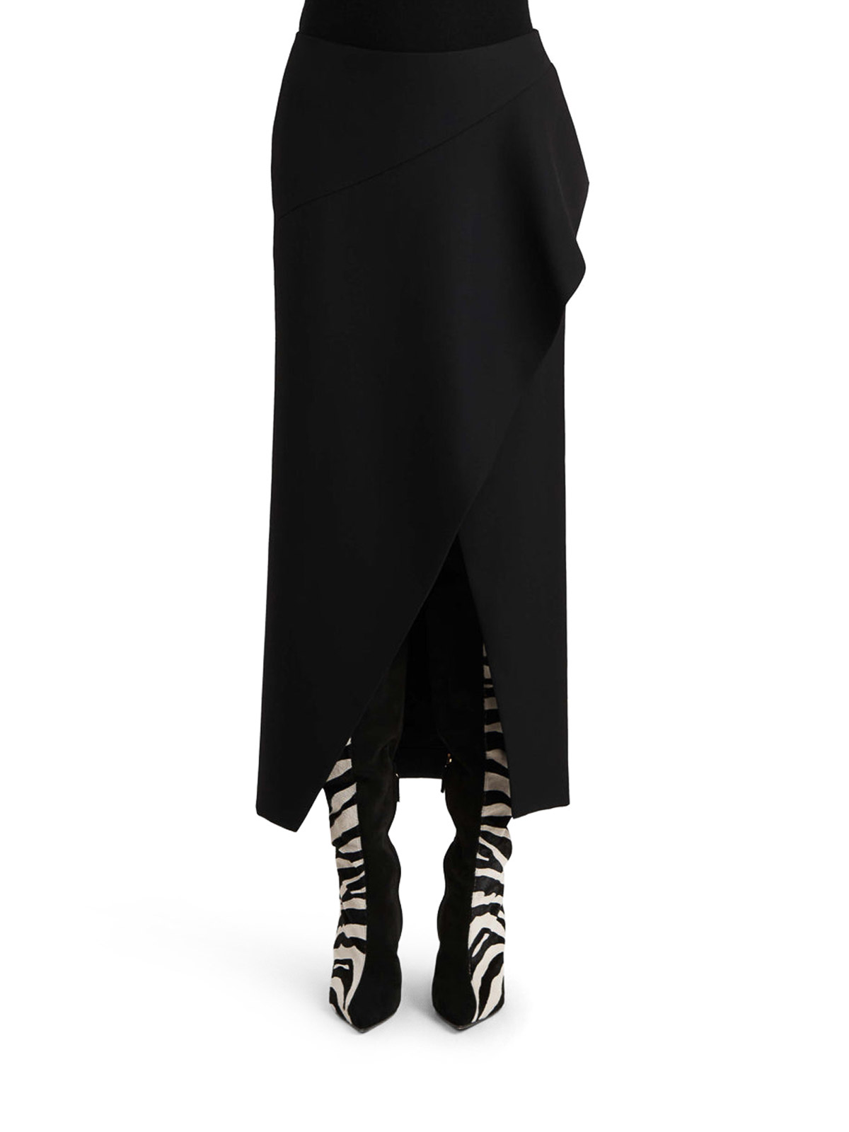 流れるようなしなやかなスカート、平織りのウール生地、左右非対称のドレープパネル、バックシーム、隠しファスナー、モデルの身長は1.78m、サイズ2を着用しています。色:黒