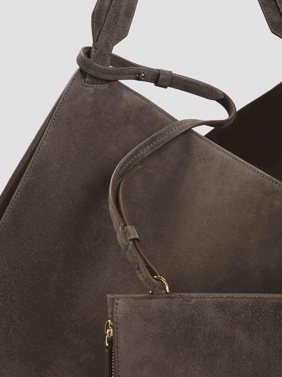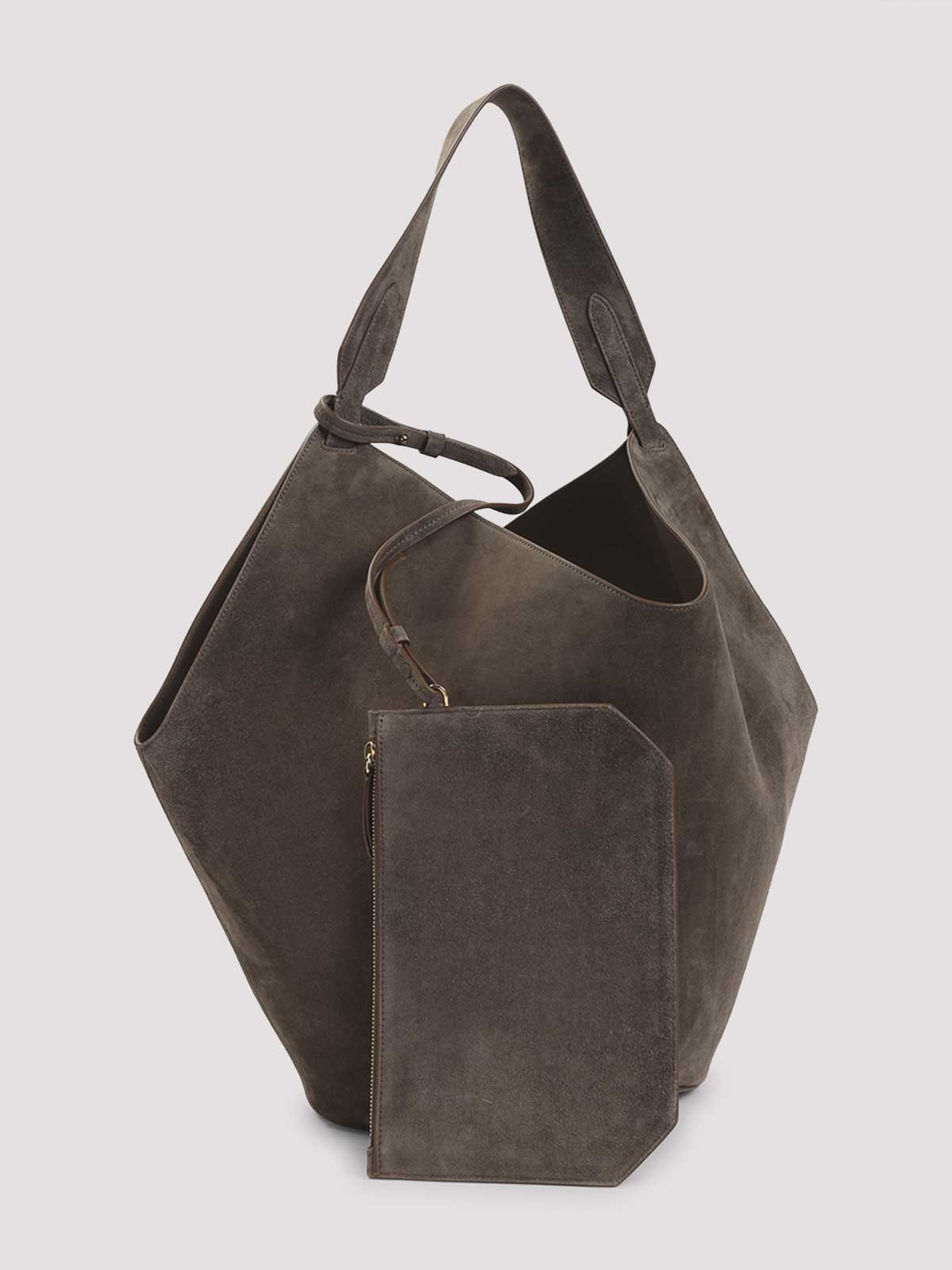 Khaite Lotus ミニブラウンカーフスキントートバッグ。ブラウンのスエードレザー製で、トップハンドル、取り外し可能なファスナーポーチ、前面にロゴが付いています。