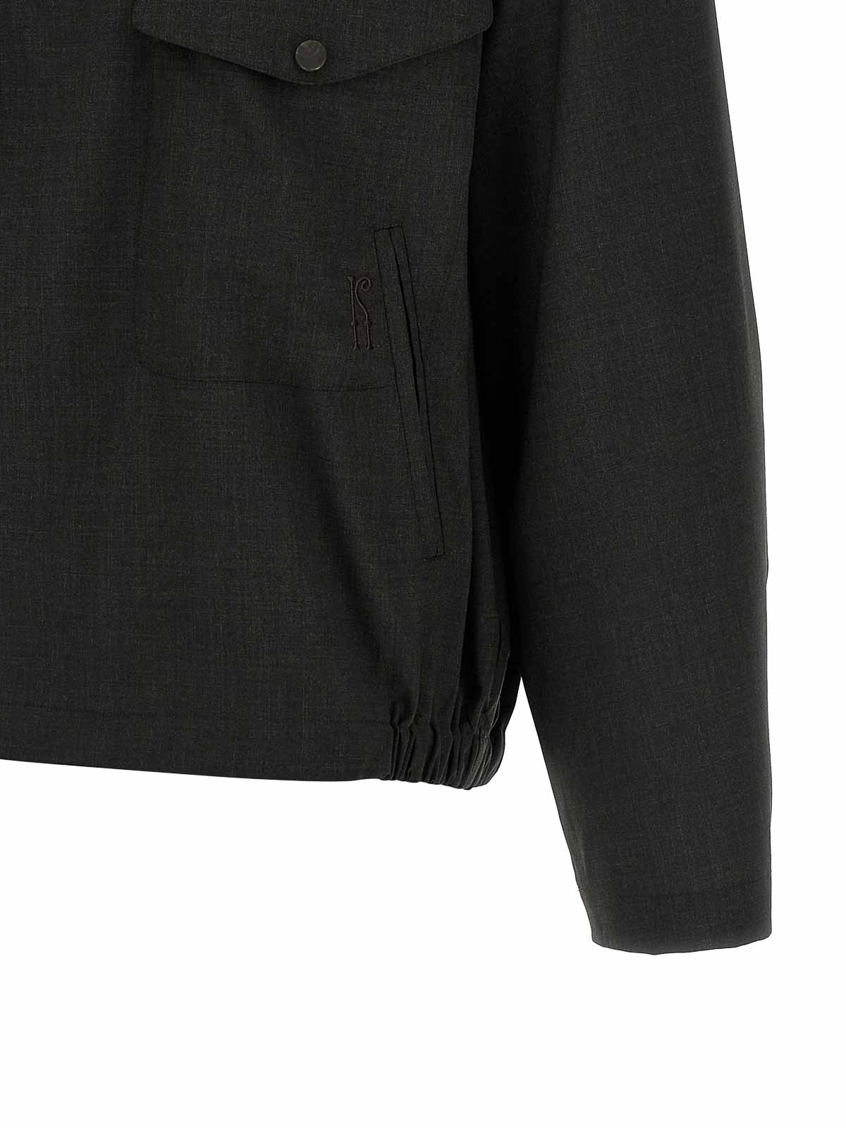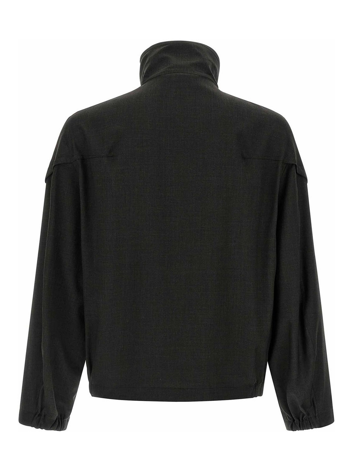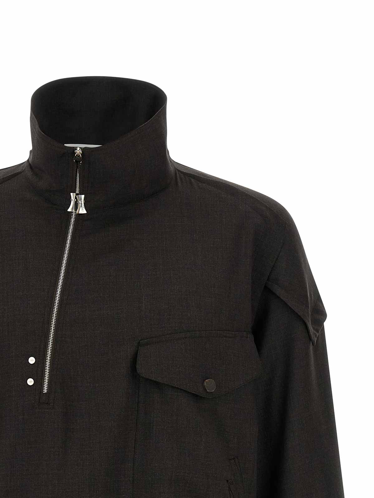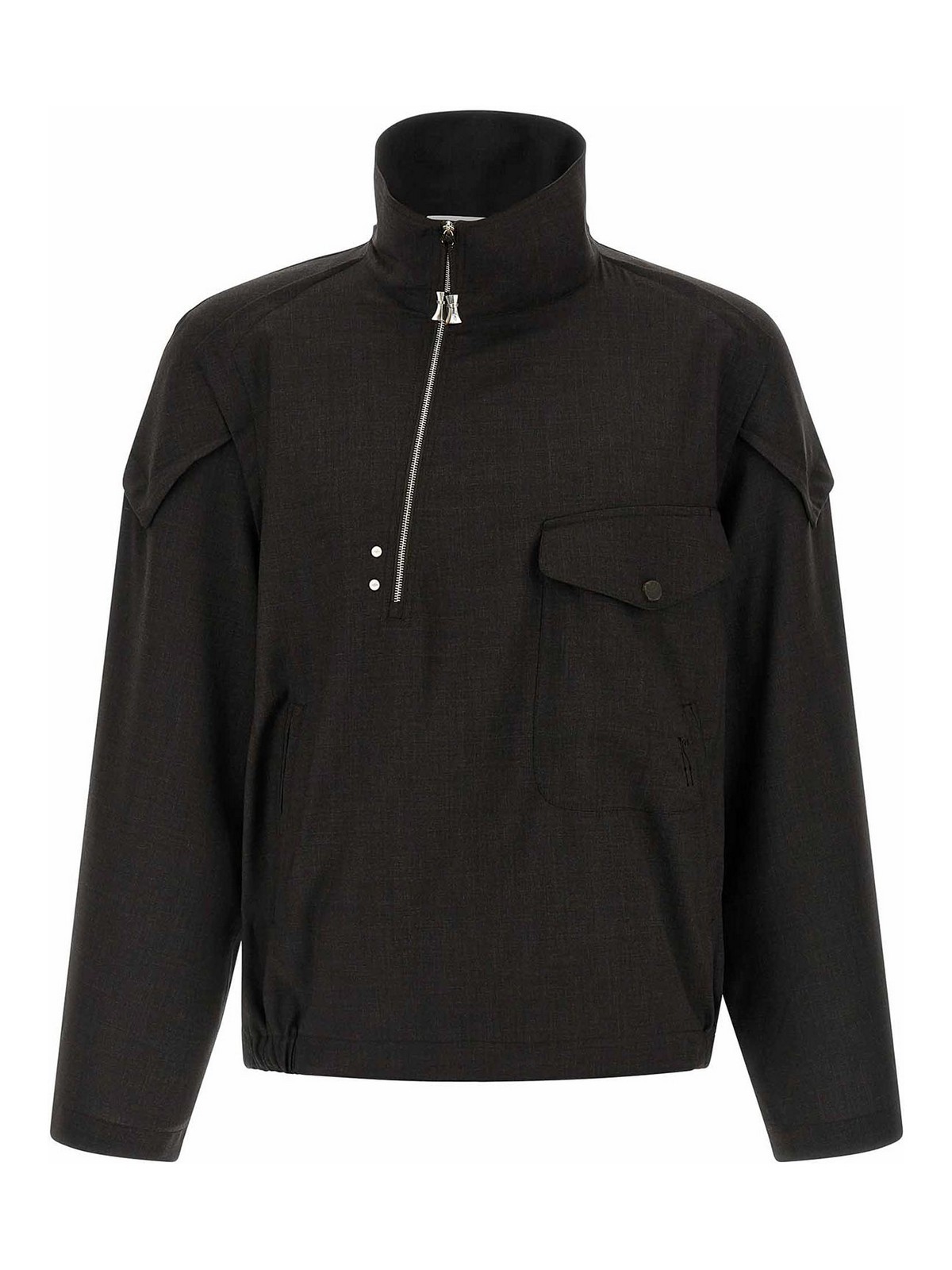 ダークネック、トーン・オン・トーンのロゴ刺繍、フロントにアシンメトリーなハーフジッパーをあしらったライトなブルガリアンウール製ファルカスのジャケット。ポケット、肩にダブルピンタック、部分的に伸縮性のある袖口が付いたロングスリーブ、裾にサイドゴム入り、裏地なし。