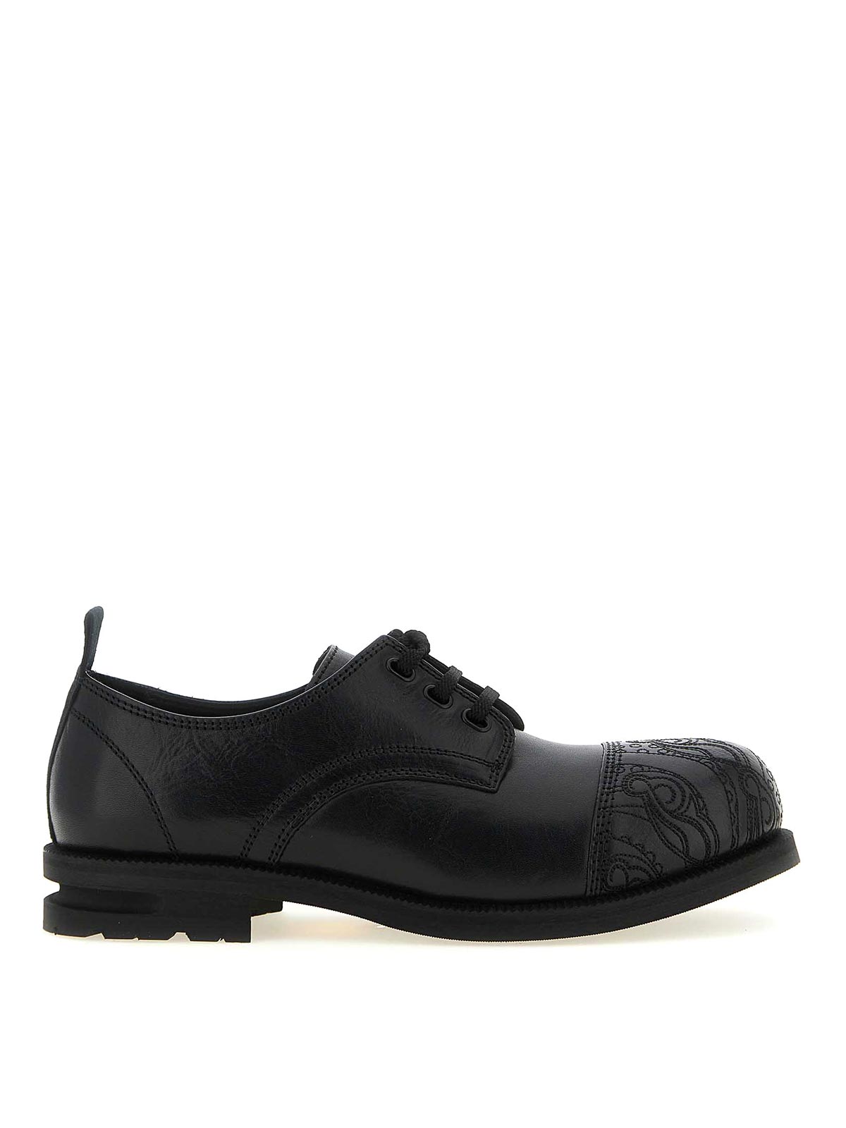 ダービースタイルのアトロカウハイドレースアップシューズ、トーン・オン・トーンのペイズリー柄の丸いつま先、レースアップクロージャー、ビブラムラバーソール。