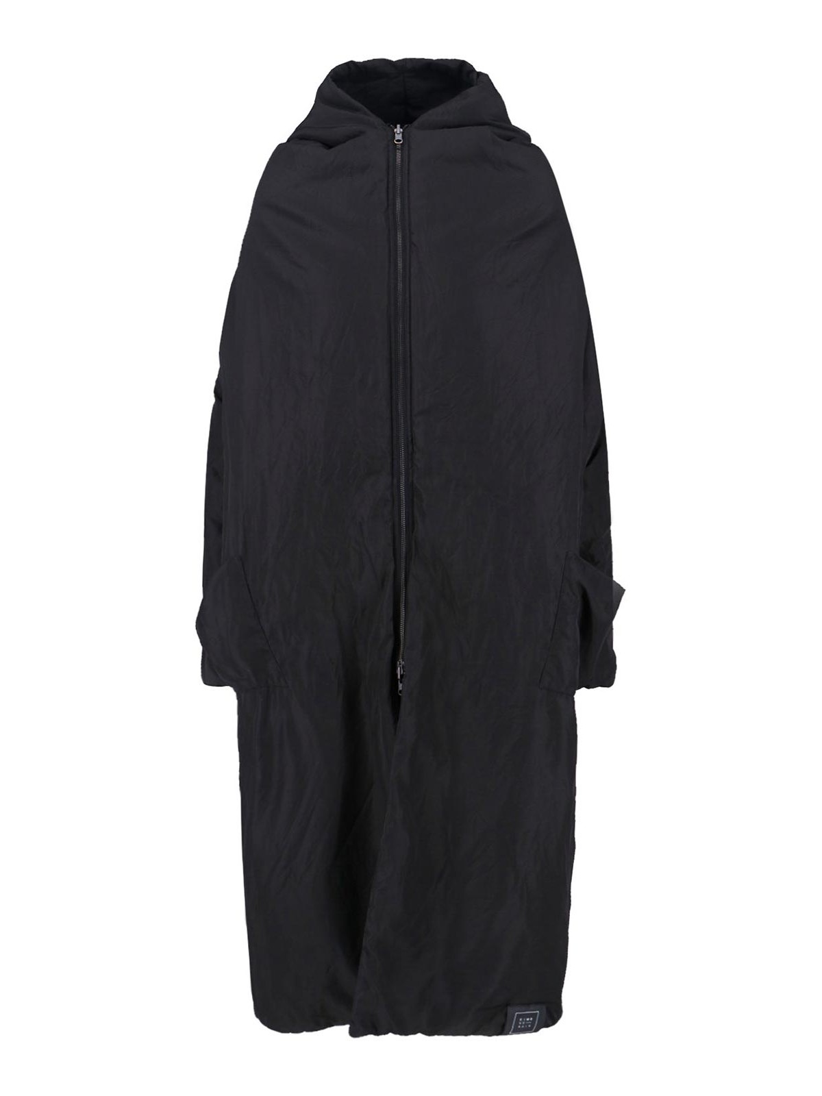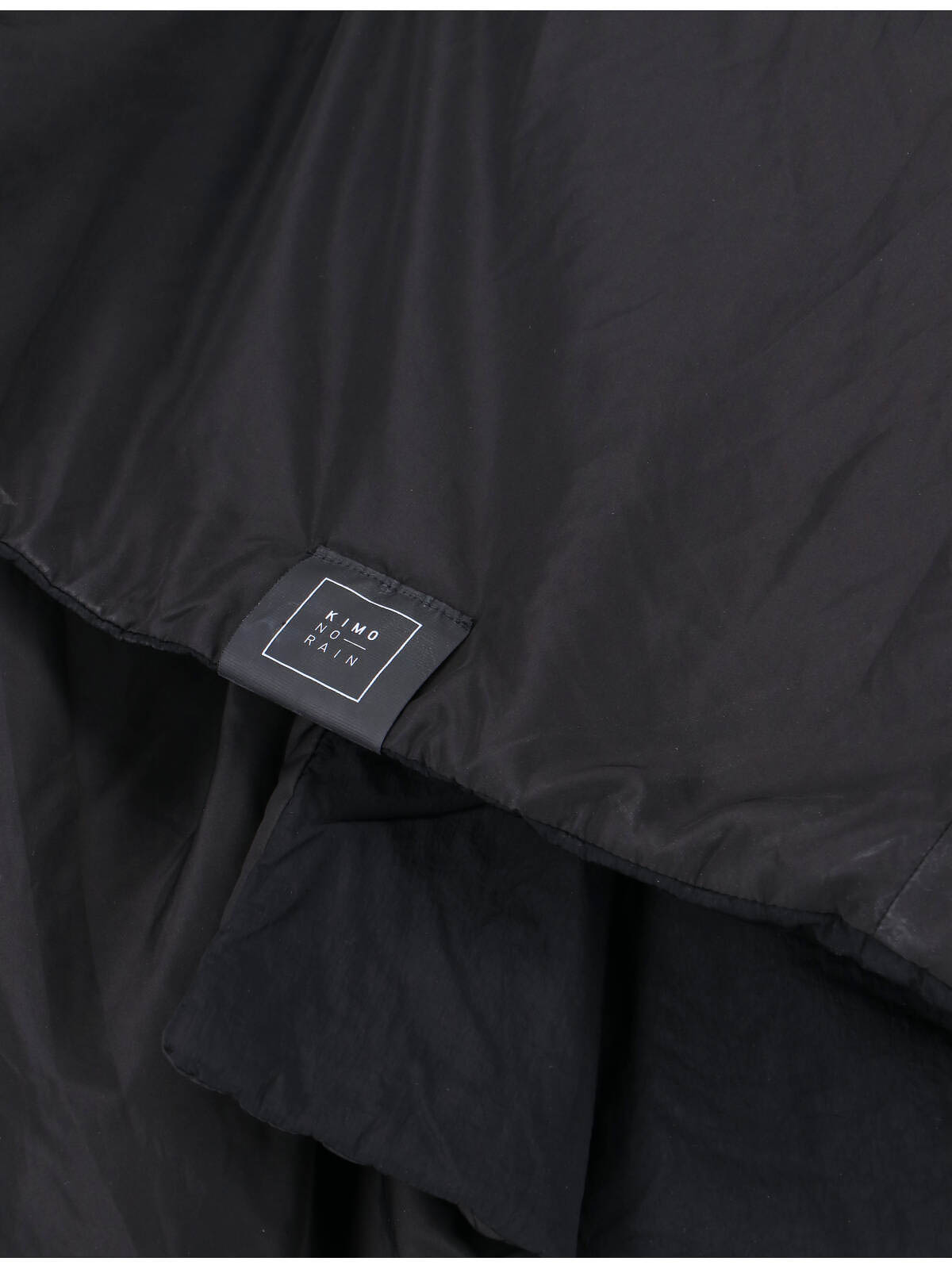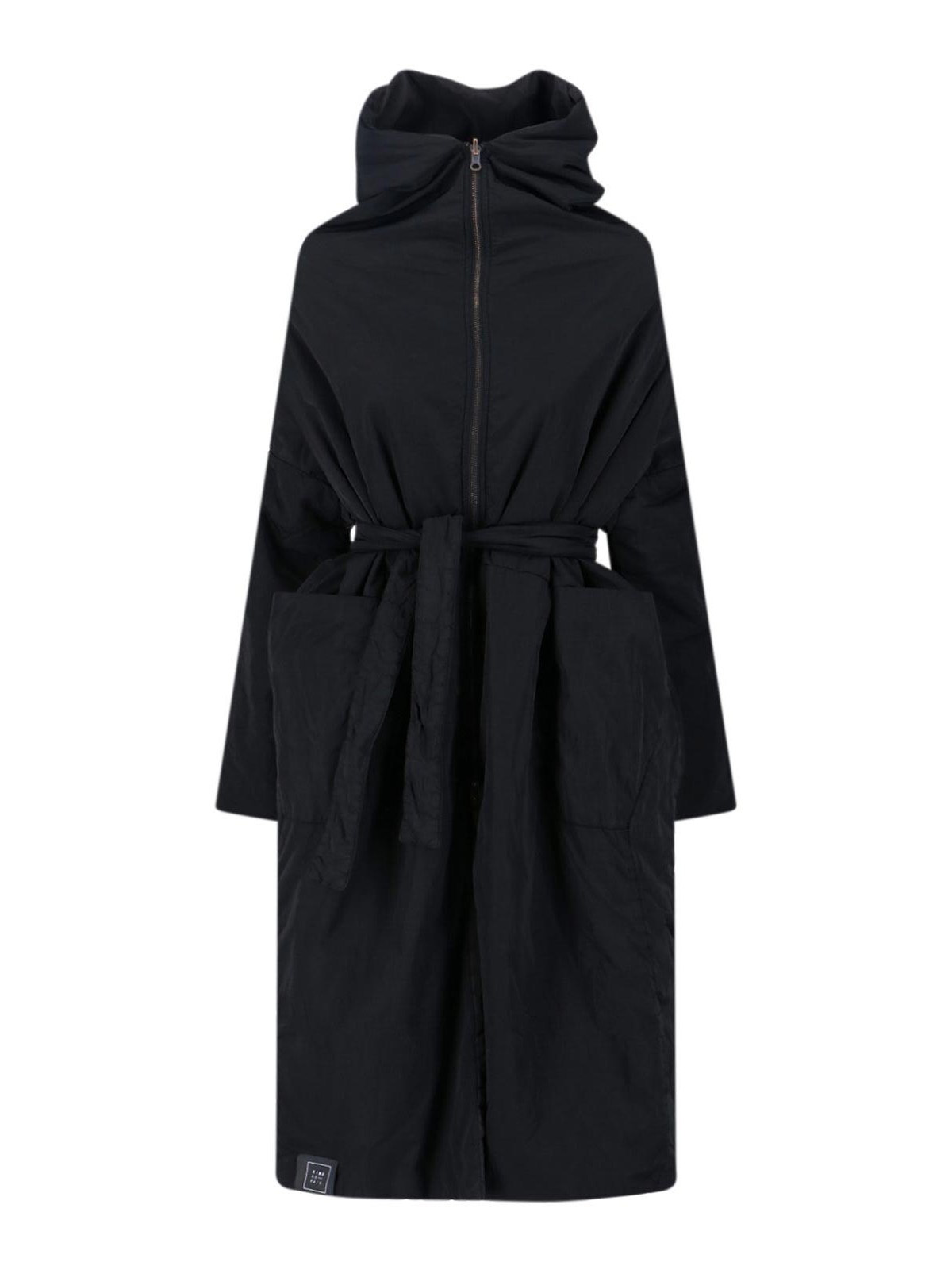 リバーシブルキモノーレインコート、ブラックファブリック、フード、ジッパー、調節可能で取り外し可能なウエストベルト、マキシサイドポケット2つ、サイドロゴパッチ、伸縮性のあるショルダーストラップディテール、ストレートヘム。