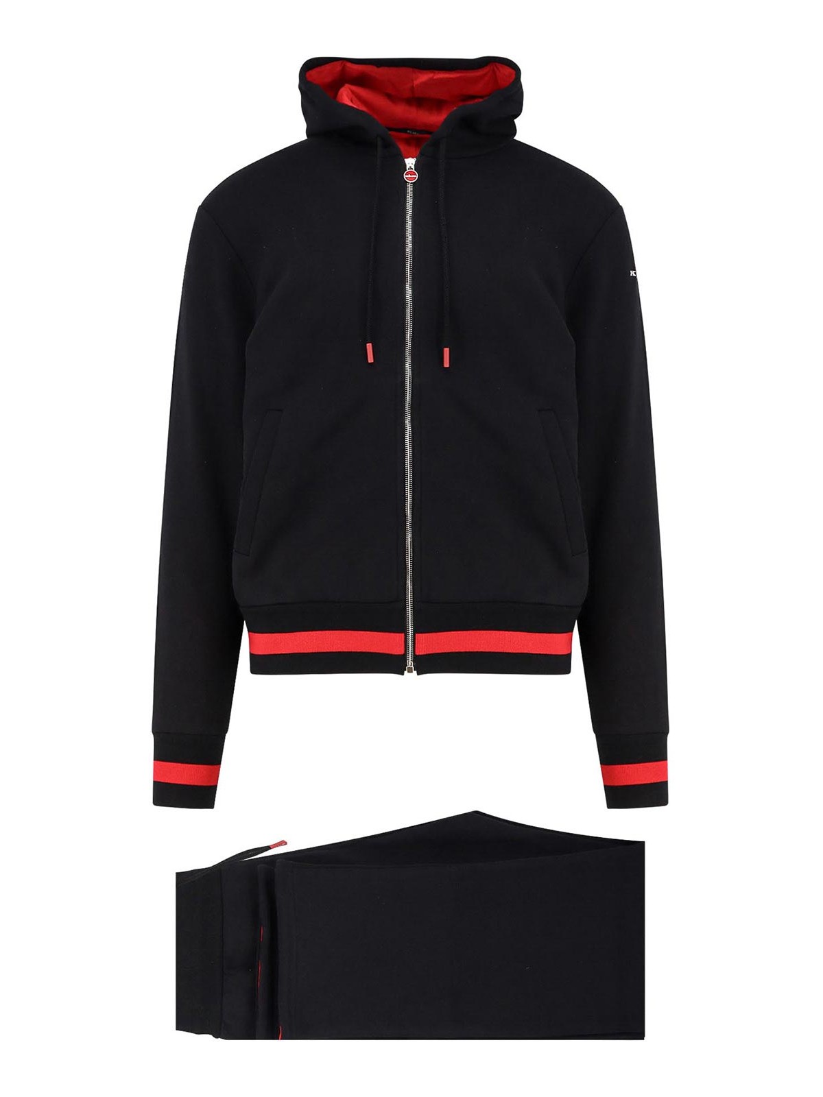 フード付きスウェットシャツ、調節可能なドローストリング、フロントにジッパーとウェルトポケット、左袖にロゴ刺繍、ウエストに調節可能なドローストリング付きパンツ、フロントウェルトポケット、バックウェルトポケット、100% コットン、イタリア製