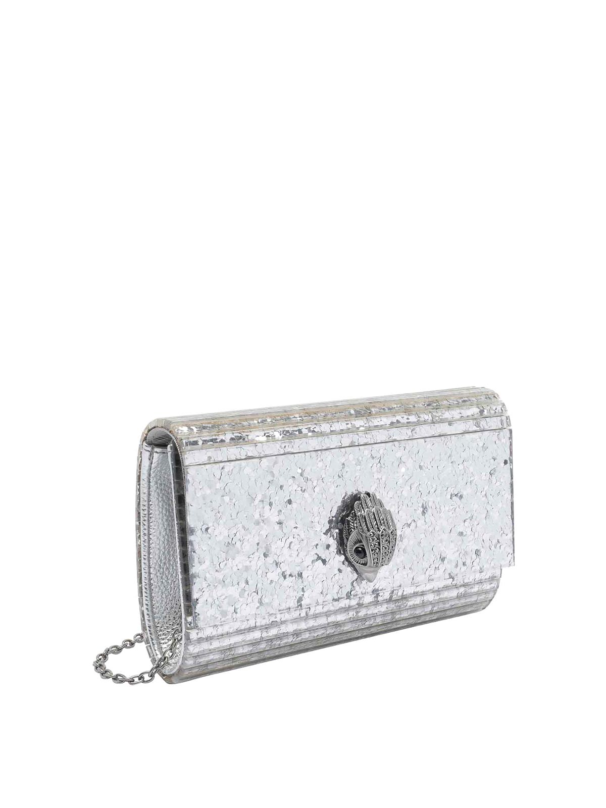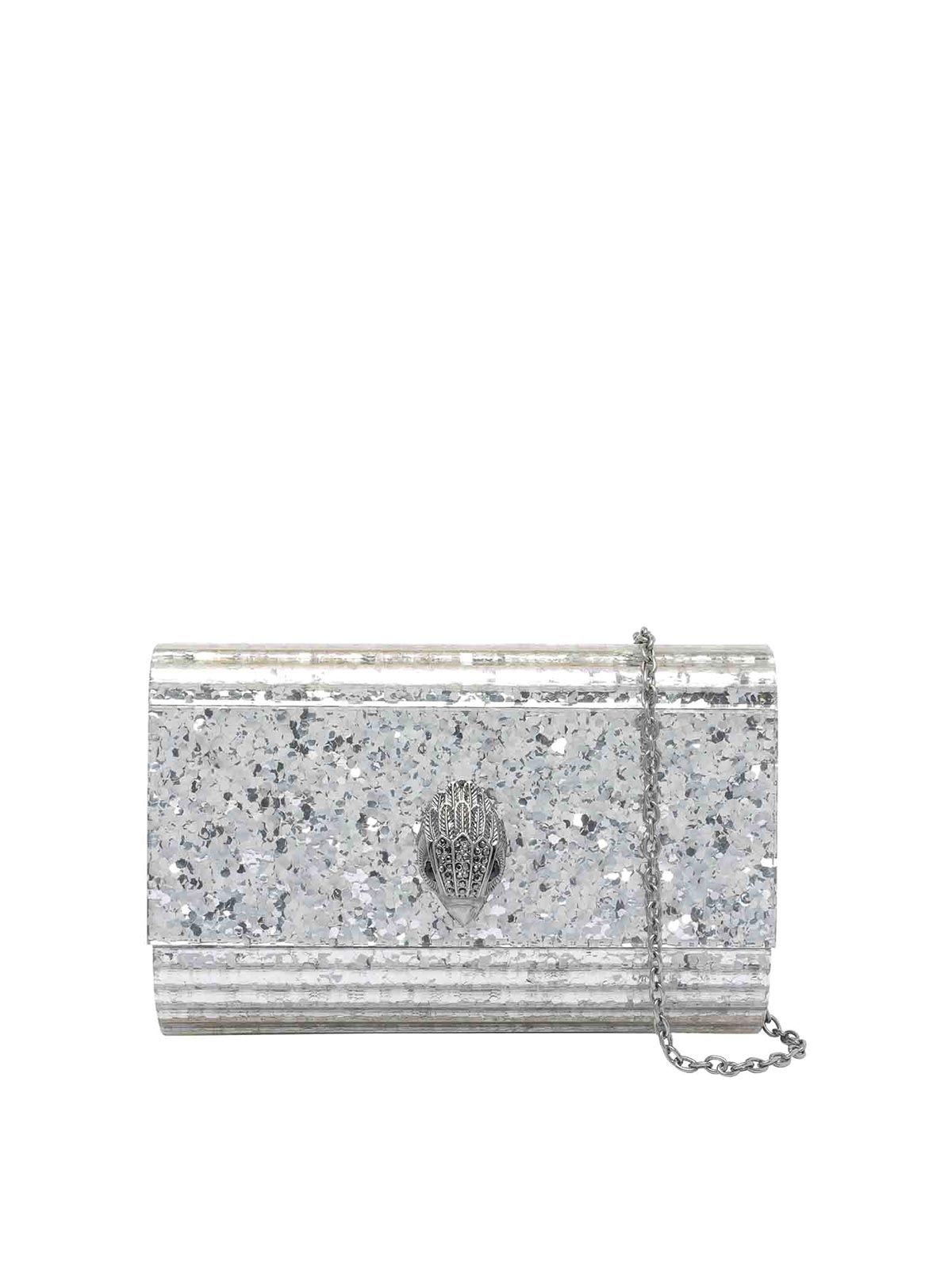 Kurt Geiger シルバーパーティーイーグルクラッチ、マグネットクロージャー、内側オープンポケット、取り外し可能なチェーンストラップ、正面ロゴ