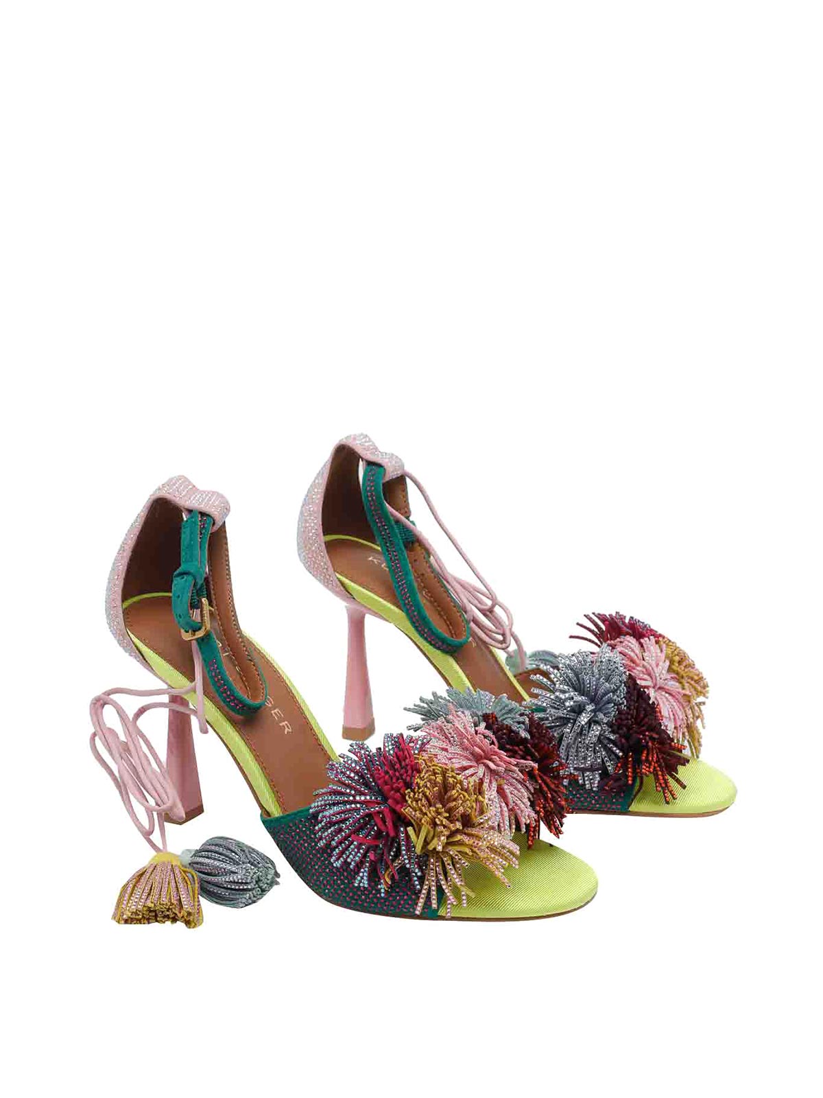 Kurt Geiger マルチカラーポンポンネクタイパンプスサンダル、ラウンドトウ、ポンポンディテール、ラテラルバックルクロージャー