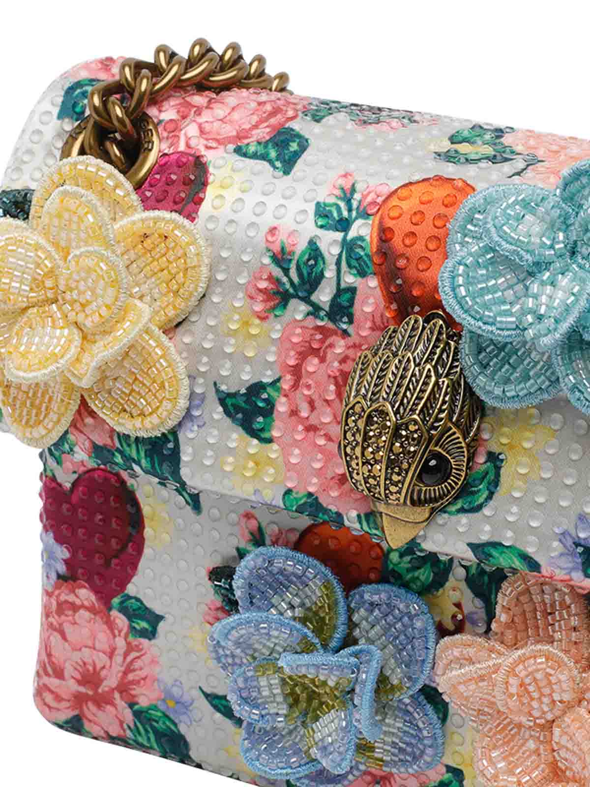 Kurt Geiger マルチカラーミニケンジントンフラワークロスボディバッグ、マグネットクロージャー、調節可能なスライドストラップ、正面ロゴ、全面に花