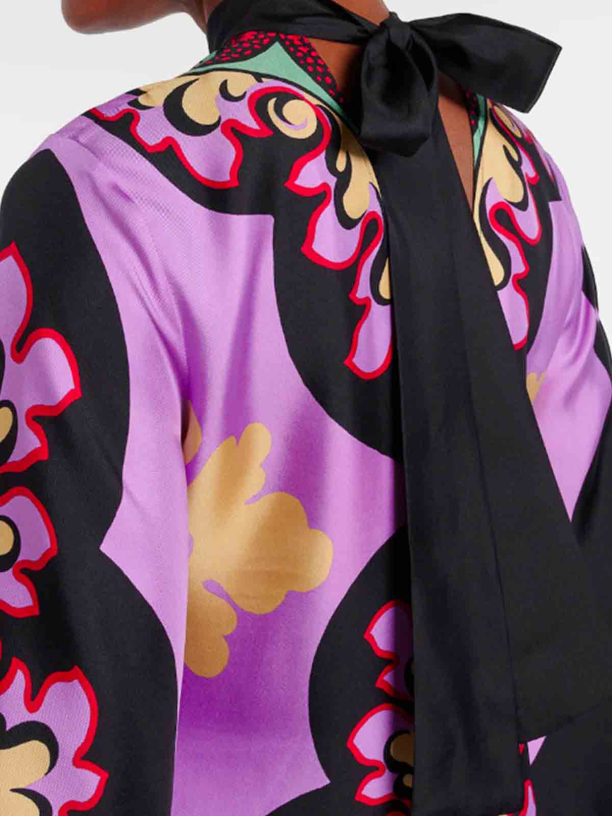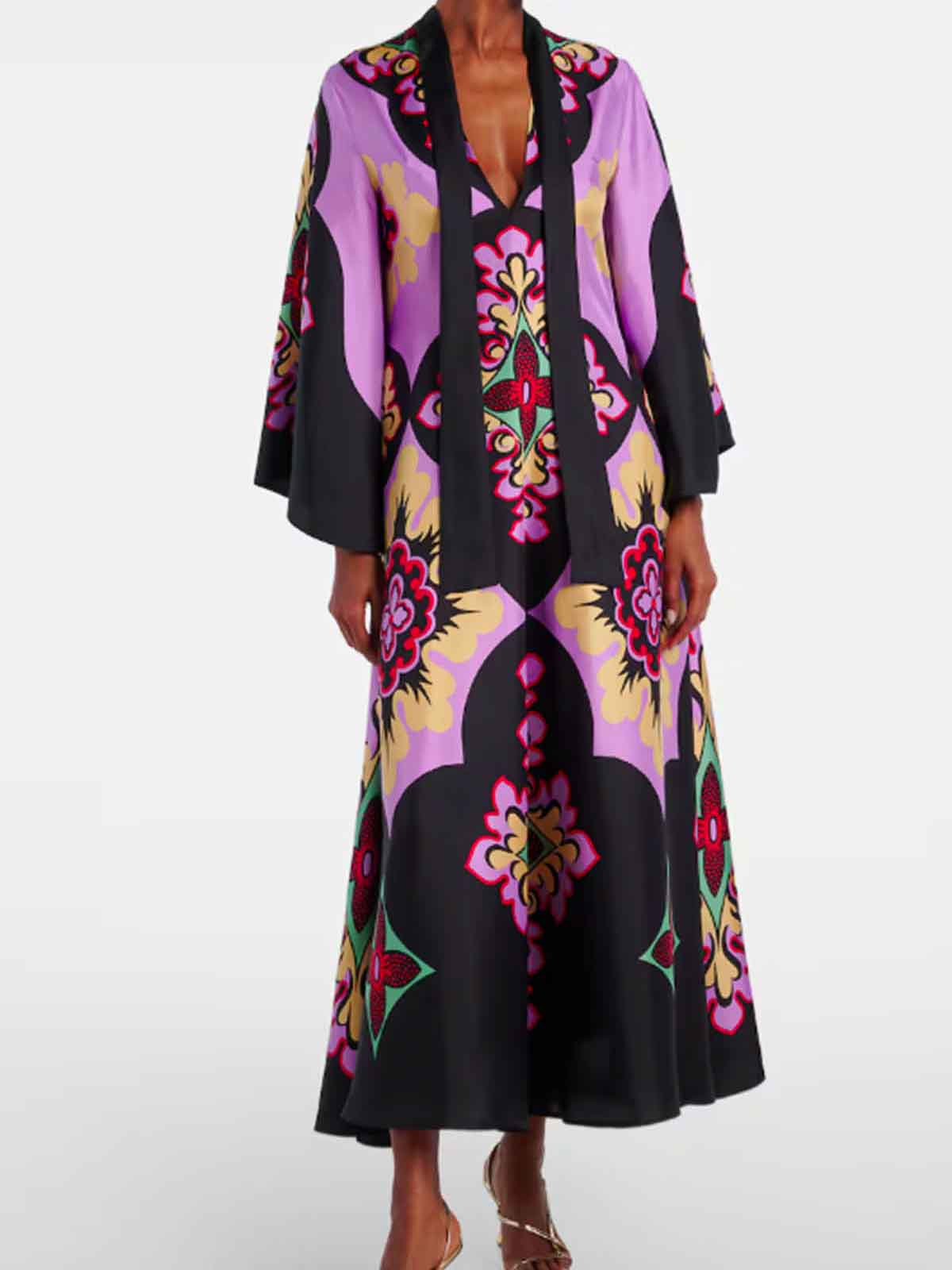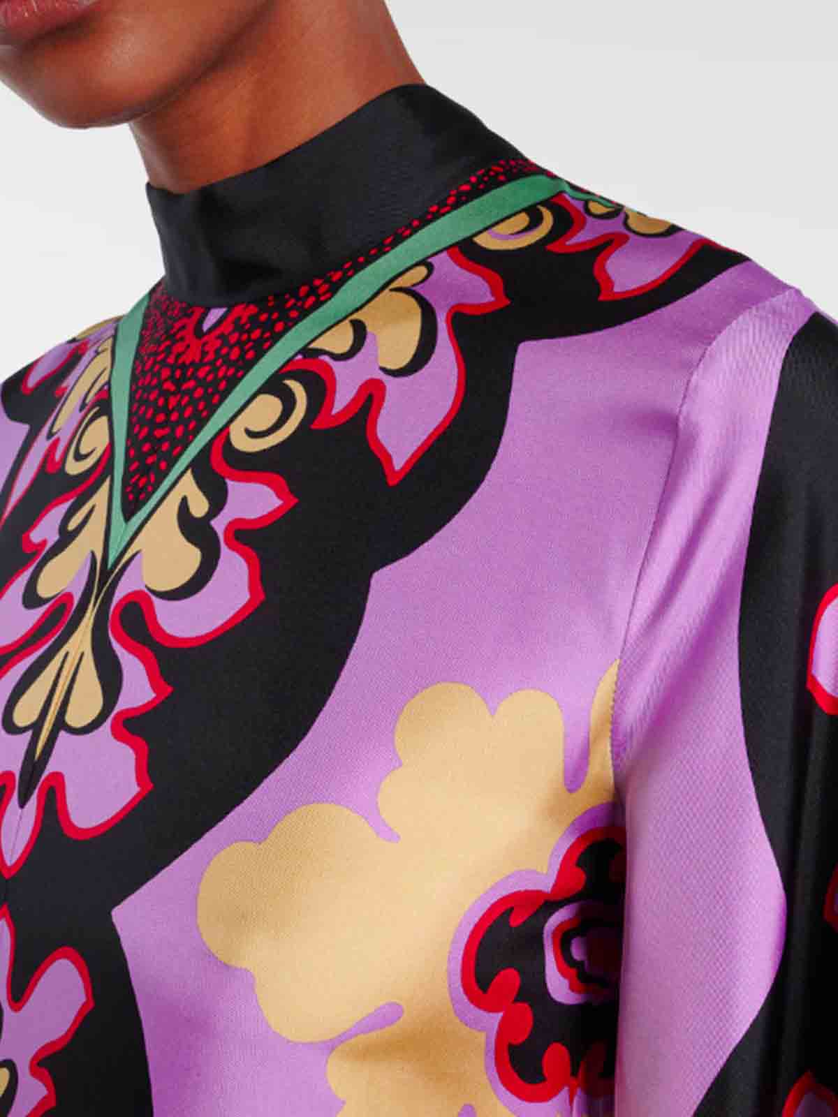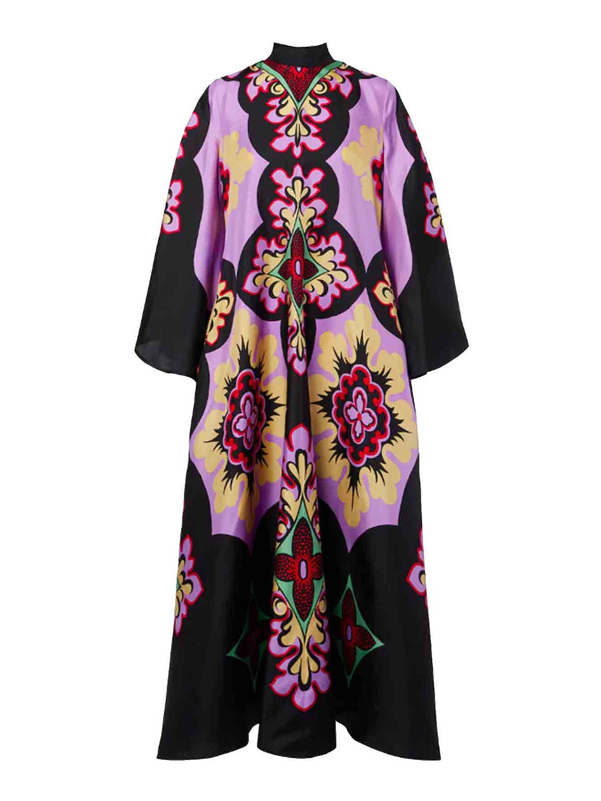 シルクツイル、手塗り模様、スタンドカラー、バックサッシュ、ウォーターフォールスリーブ、隠しサイドポケット、Vネック、ロング、ややフレアのあるデザイン。ネックラインの前にも後ろにも着用できます。素材 100% シルク、イタリア製