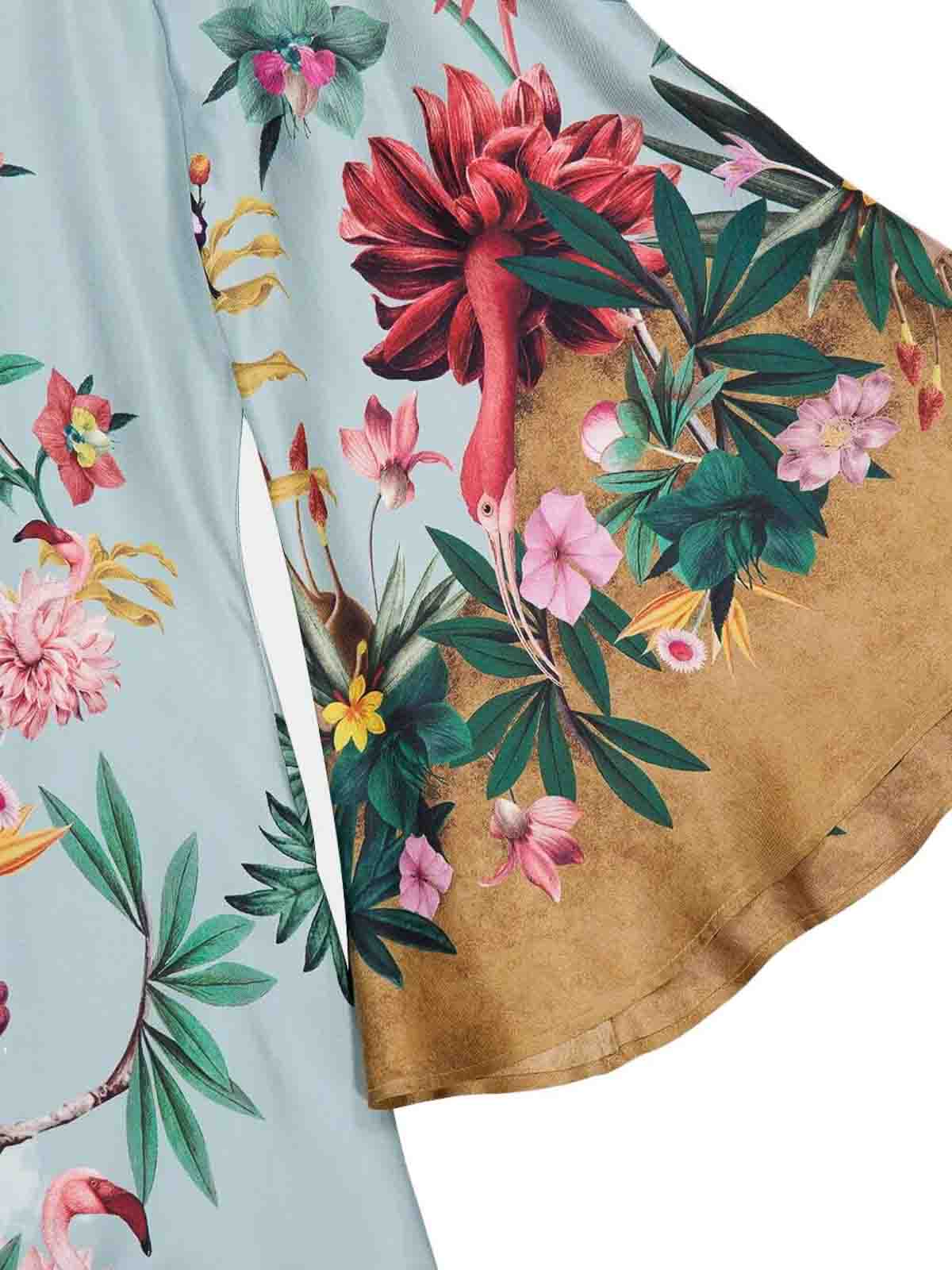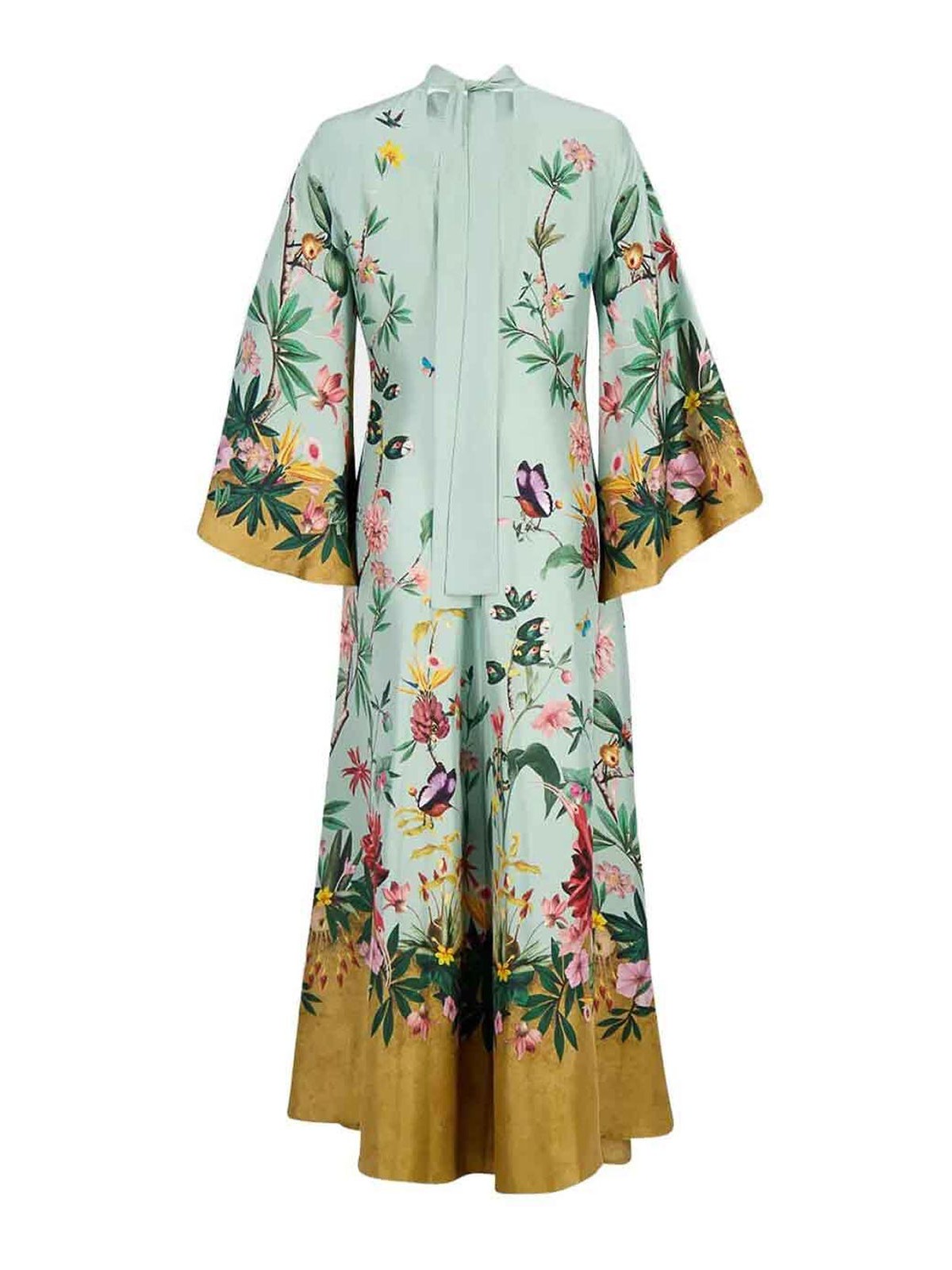 全体にグラフィックプリント、ソフトなライン、動きに合わせてデザインされた構造のロングシルクのドレス。