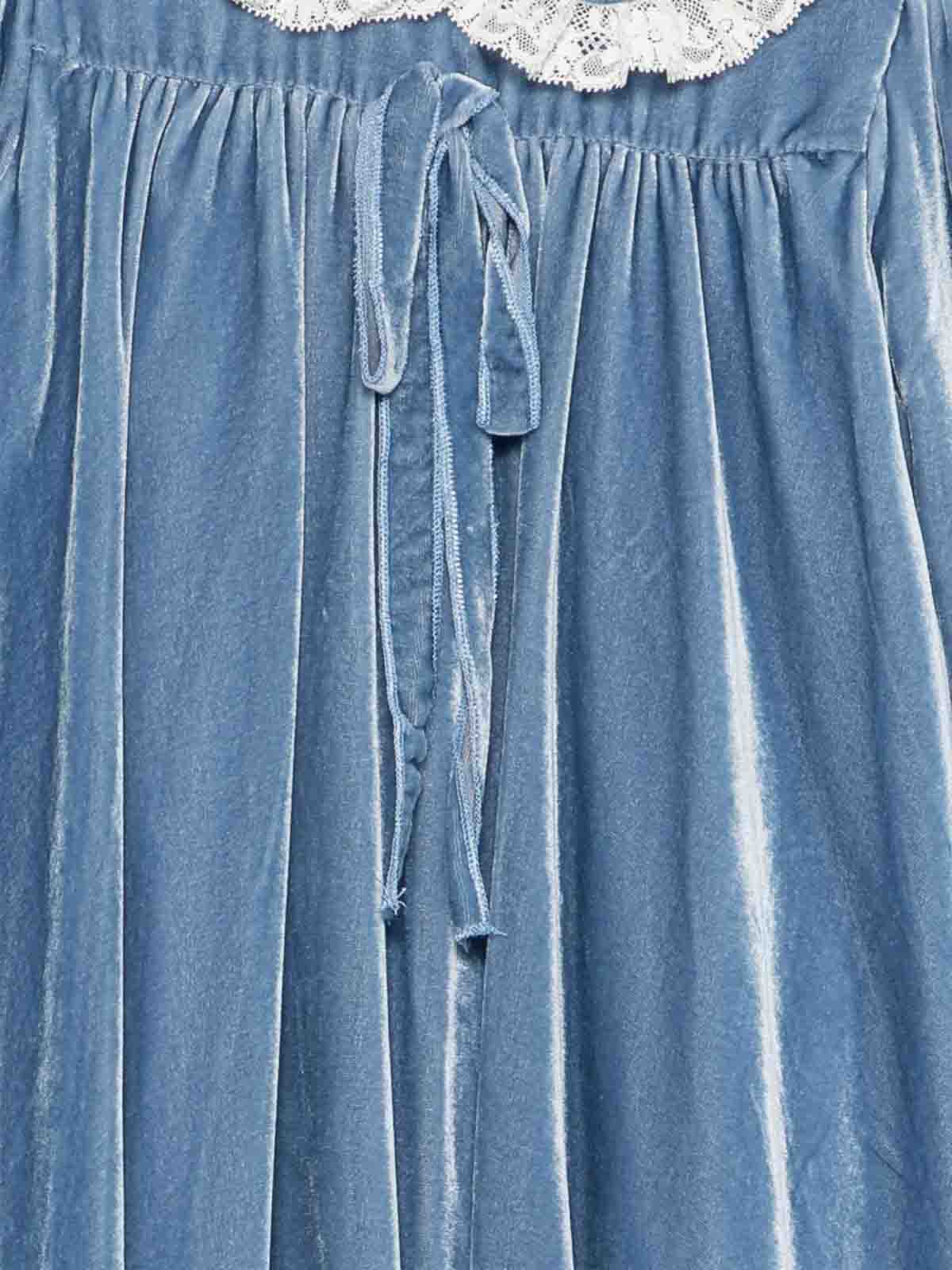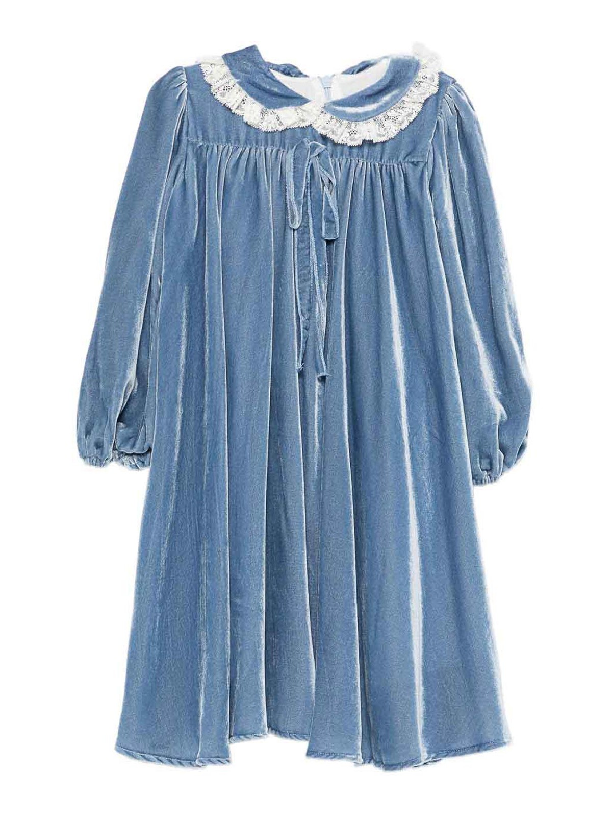 ライトブルーレースカラードレスレーストリムボウディテールロングスリーブフリルディテールクルーネック