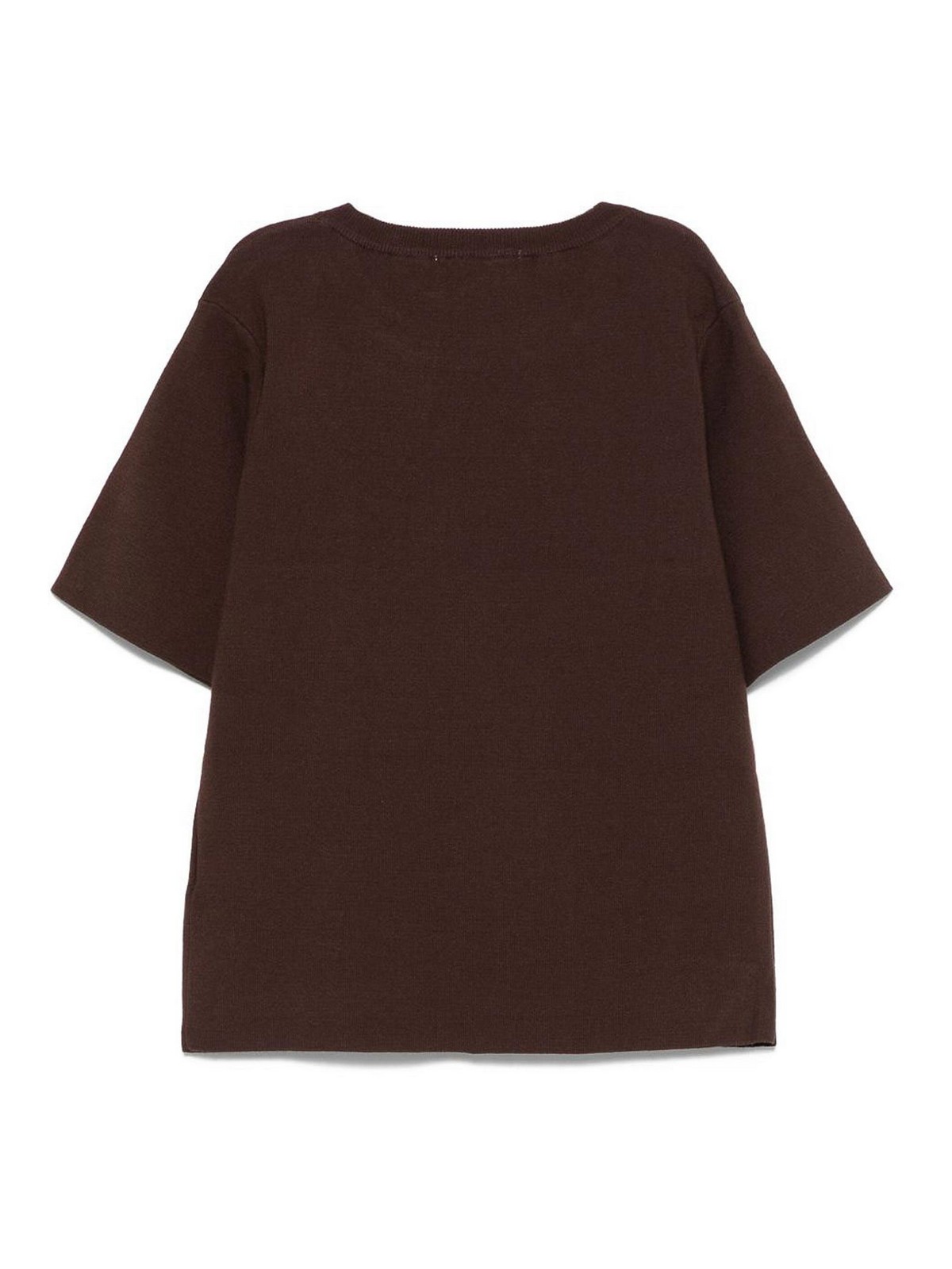 半袖プルオーバーは茶色の半袖クルーネック刺繍ロゴが特徴です。