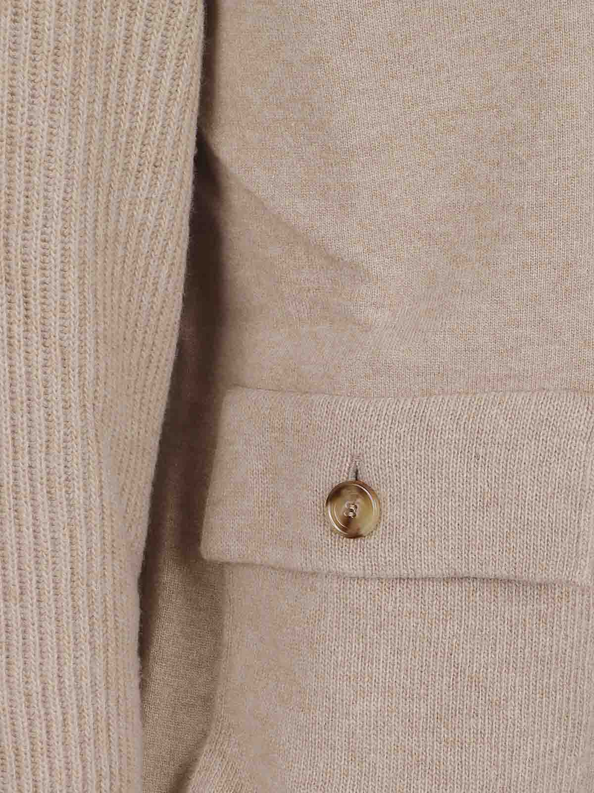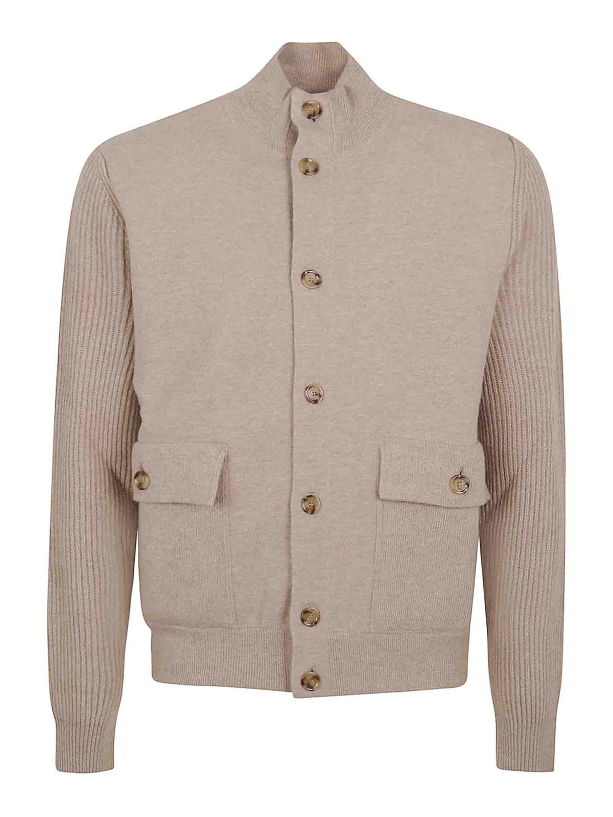 ラルディーニプレーンニットジャケット、7ボタンフロントクロージャー、ハイカラー、フラップとボタン付きパッチポケット、袖にニットカフス、スリムフィットのレギュラーフィット。