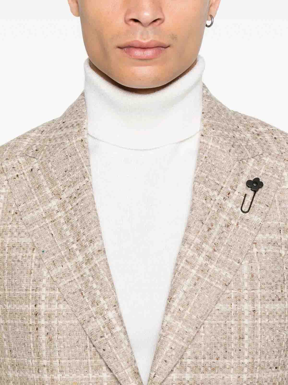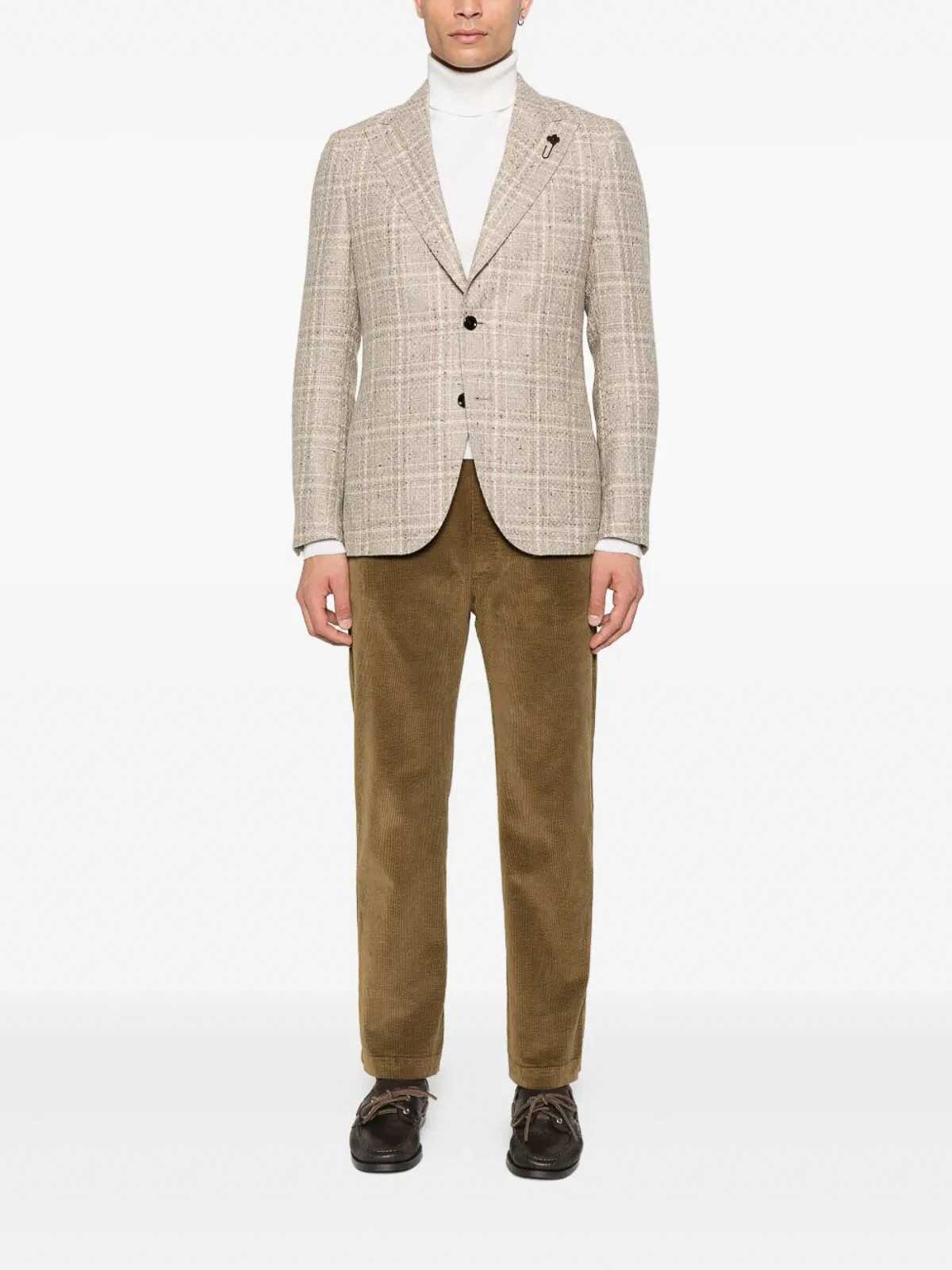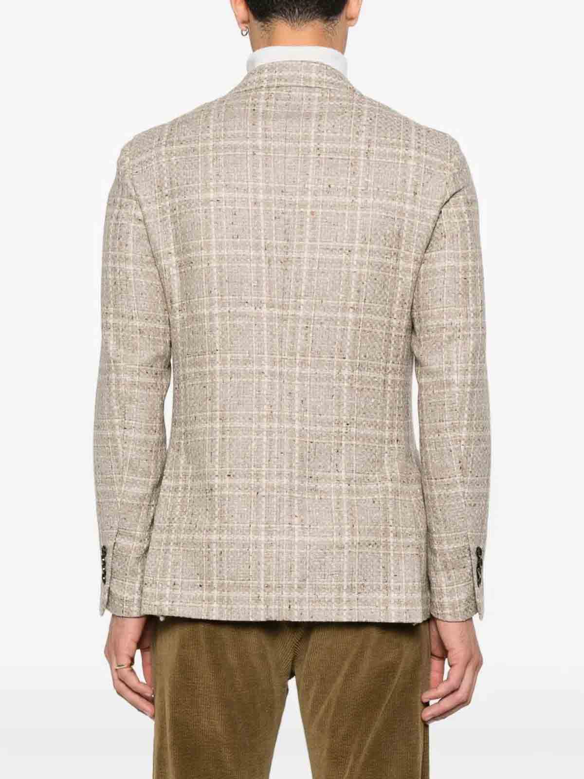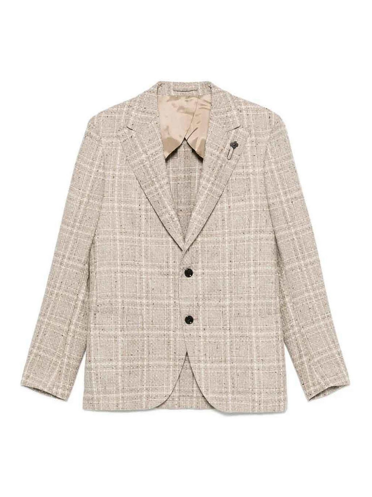 ニュートラル、チェック柄、ボタン留め、ポインテッドラペル、ロングスリーブ、フラップポケット