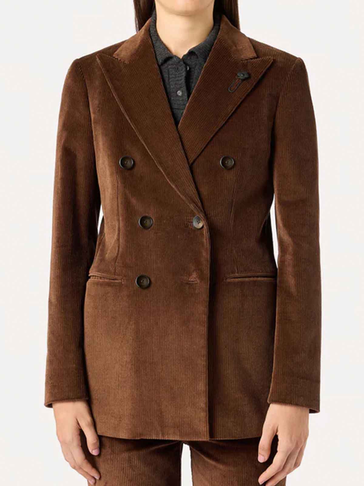 6ボタン留めの裏地付きダブルブレストモデル。エレガントでモダンなピークカラー、下部にスリットが入ったストレートスリーブ、裾にスリットが入ったストレートスリーブ、ボタンレススリット、ダブルウェルトポケットが特徴です。組成 98% コットン 2% エラステイン