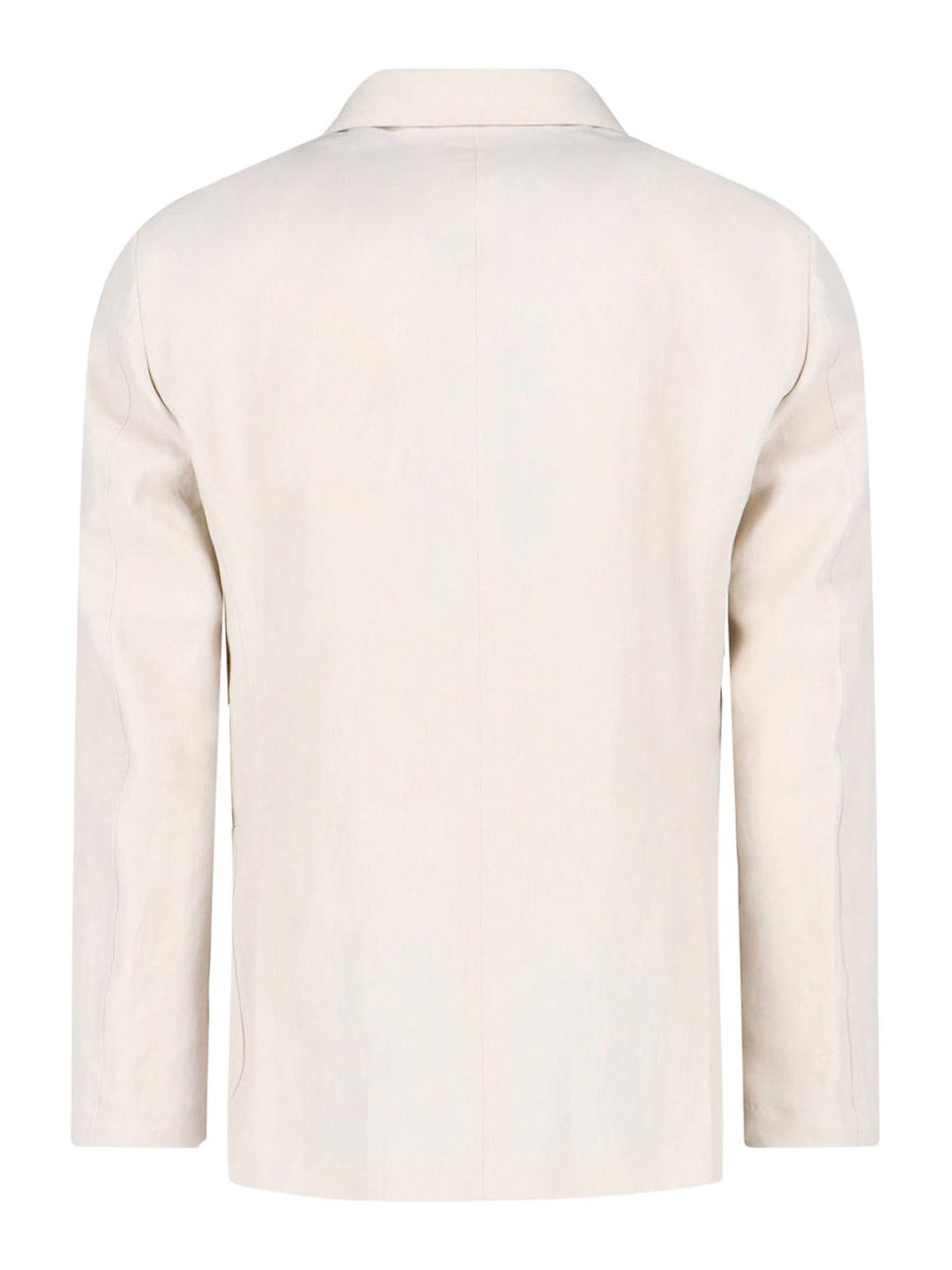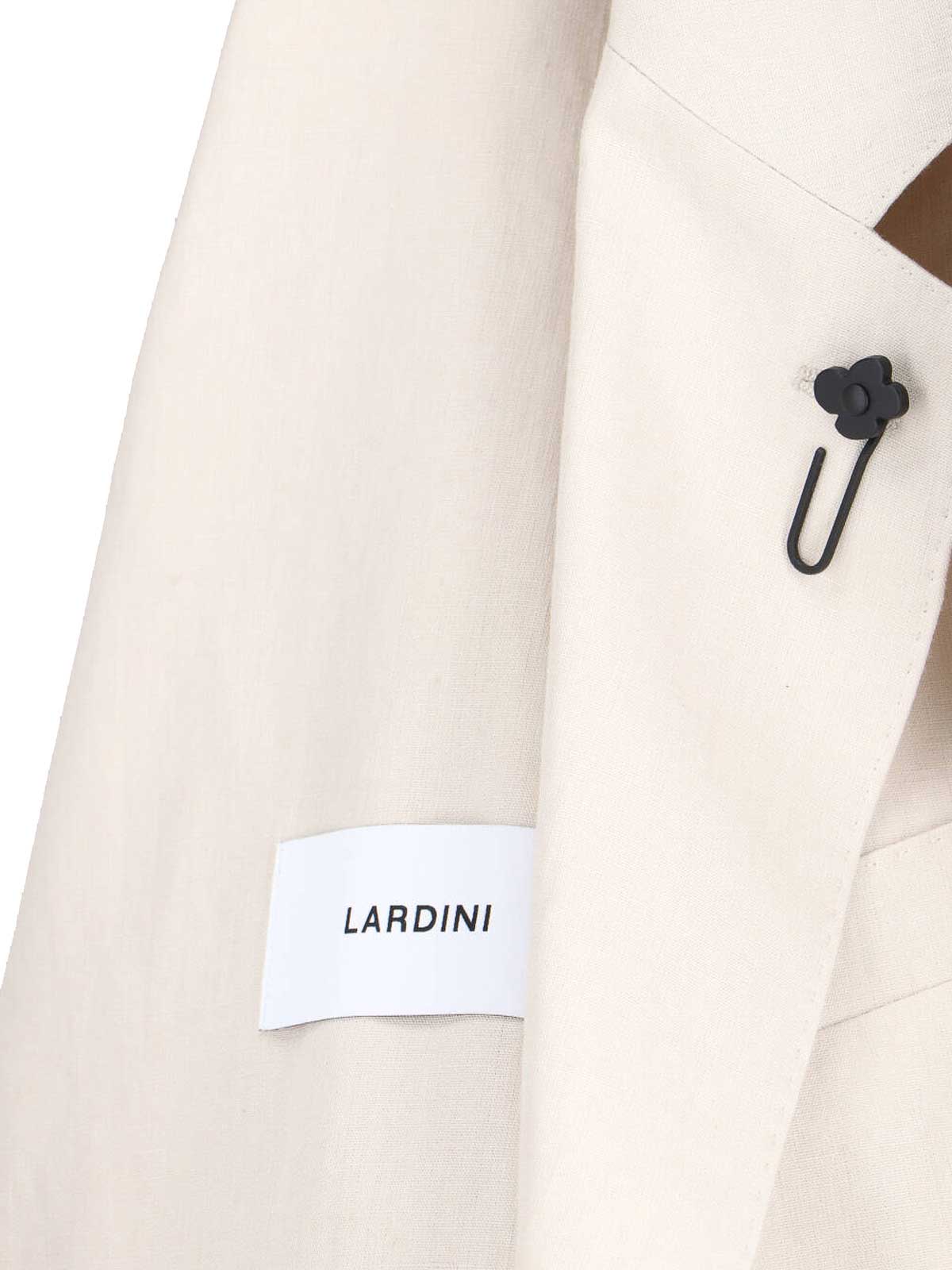 Lardini ホワイトリネン混紡シングルブレストブレザー、ラペル、シングルブレストフロントクロージャー、ロングスリーブ、フロントブローチ、フロントウェルトポケット1つ、サイドポケット2つ、ボタン付きカフス、ストレートヘム。