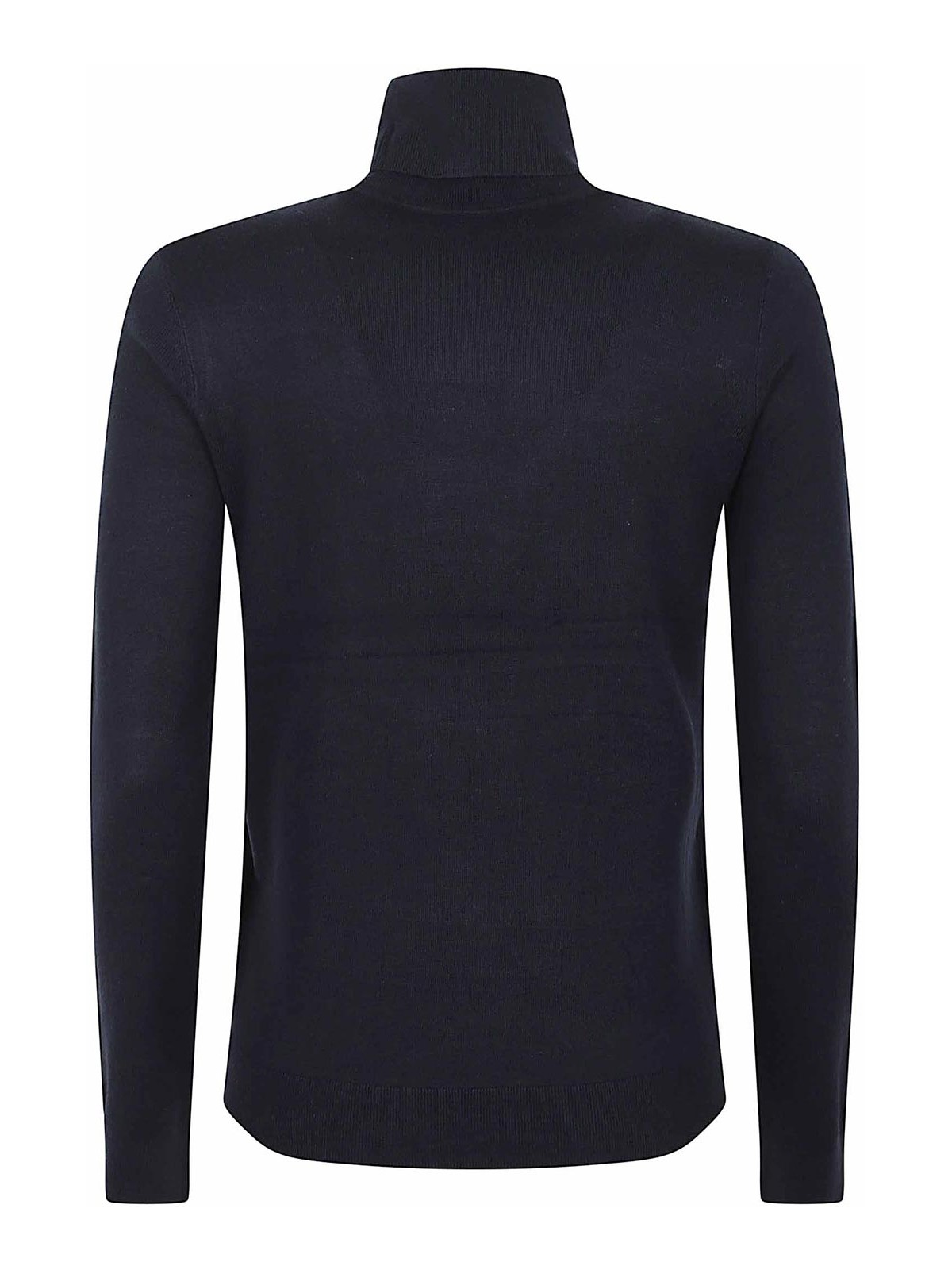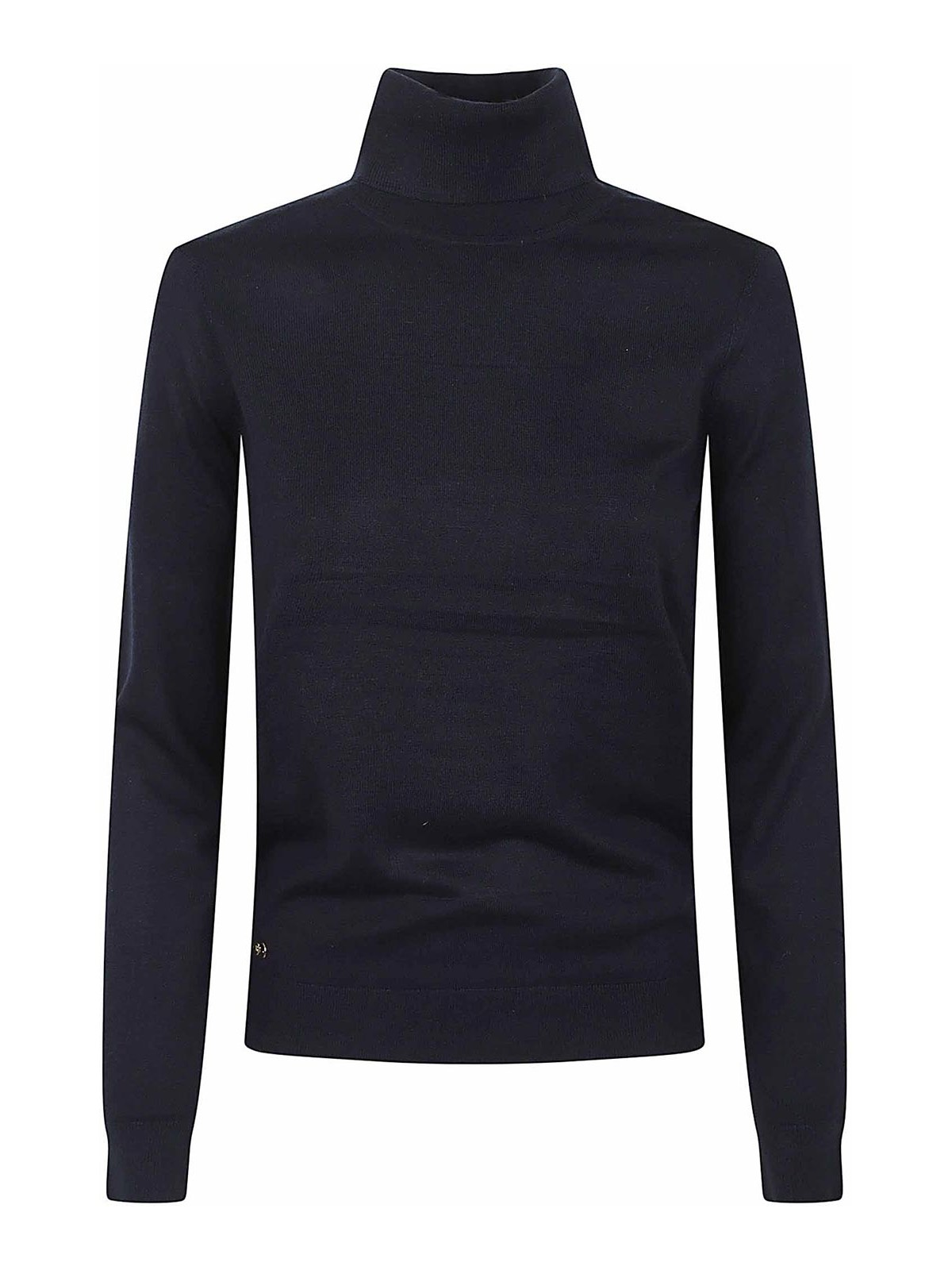 ハイカラー、ロングスリーブ、リブ編みの袖口と裾、ソフトタッチニット製のゴールドカラーのロゴプレートが付いたネイビーブルーのセーター