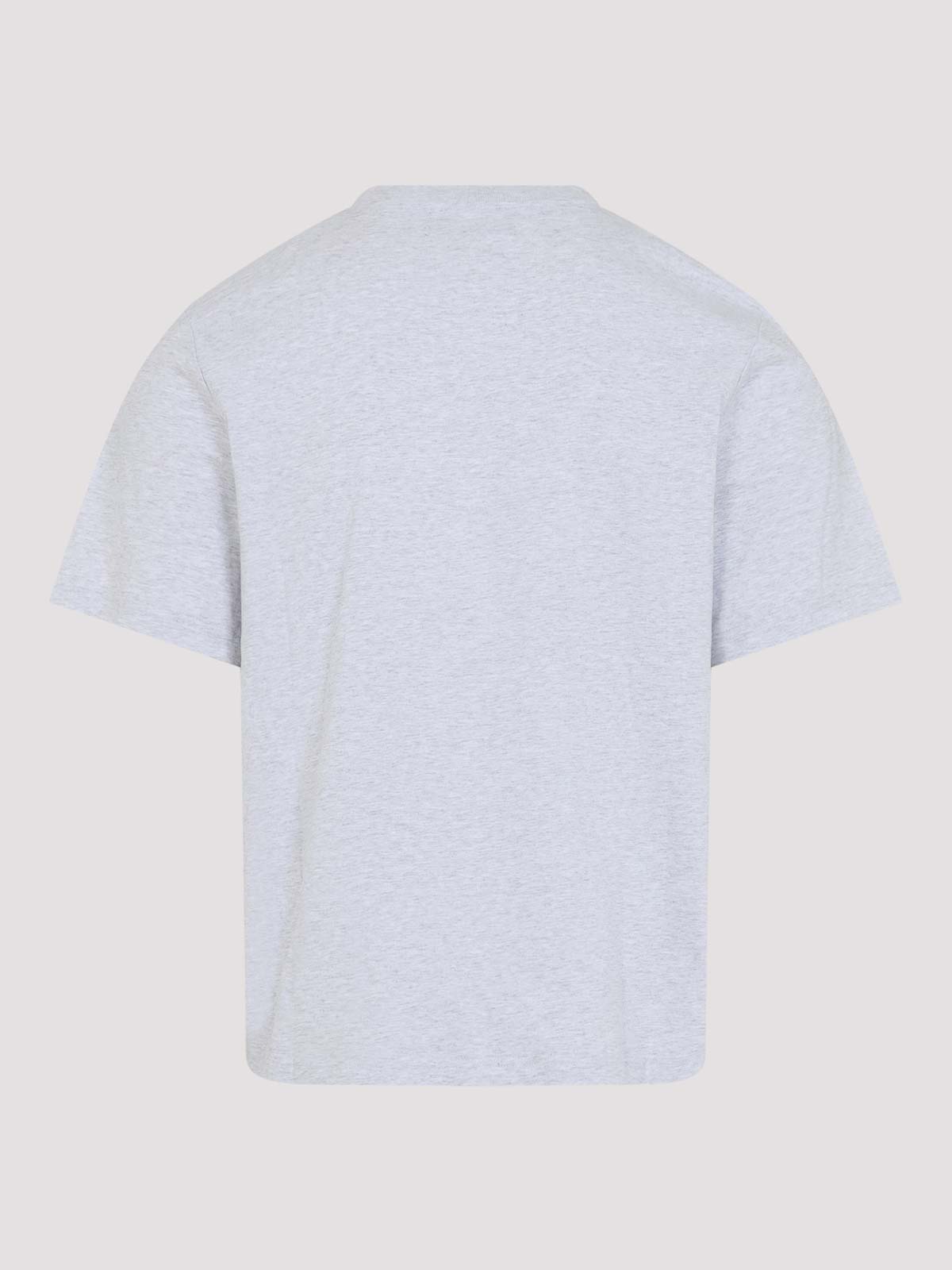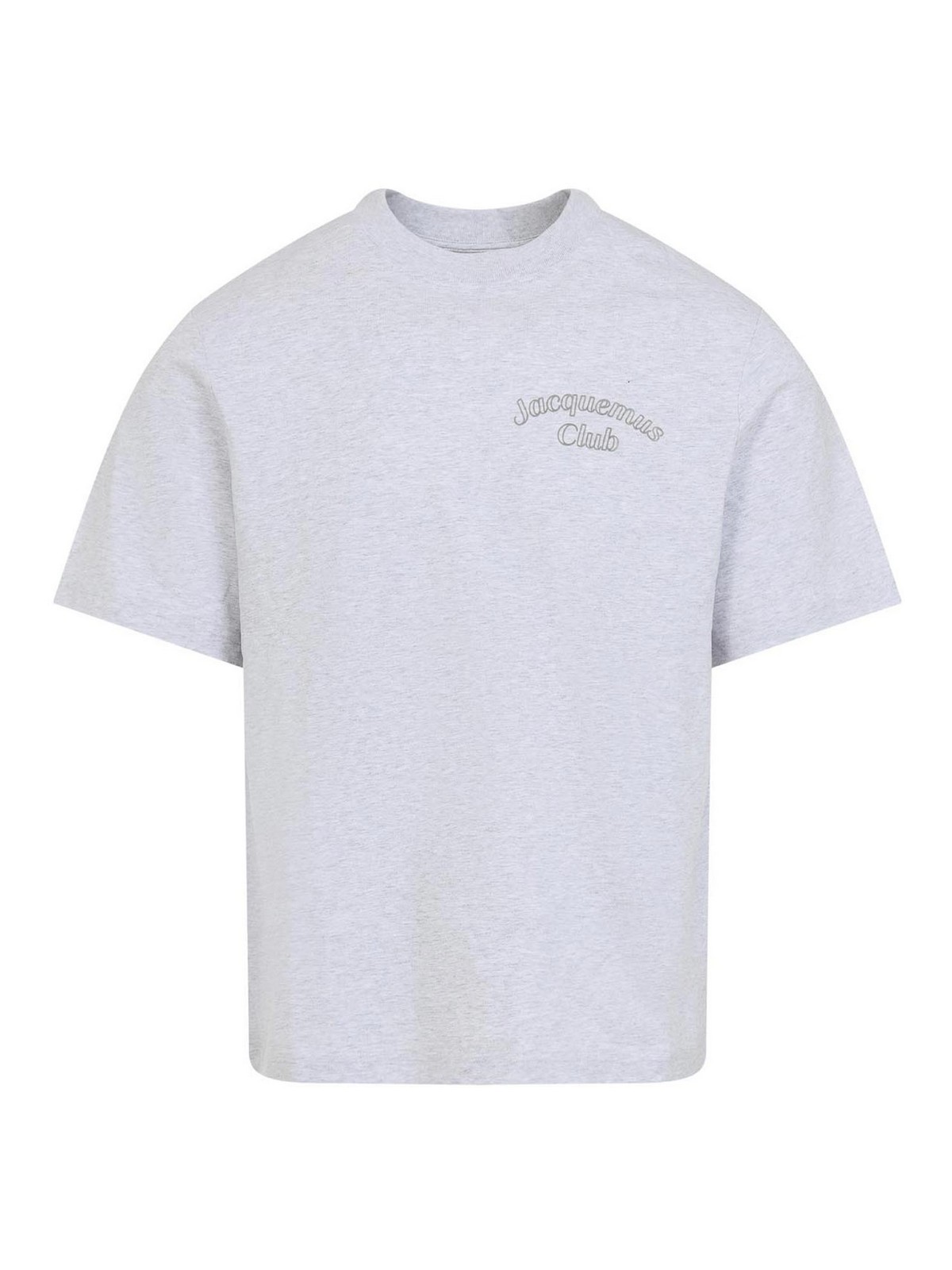 Jacquemus le club グレーコットンTシャツ。メランジグレーのコットンジャージー製、丸いリブ編みのネックライン、胸にロゴ刻印、半袖、ストレートヘム。