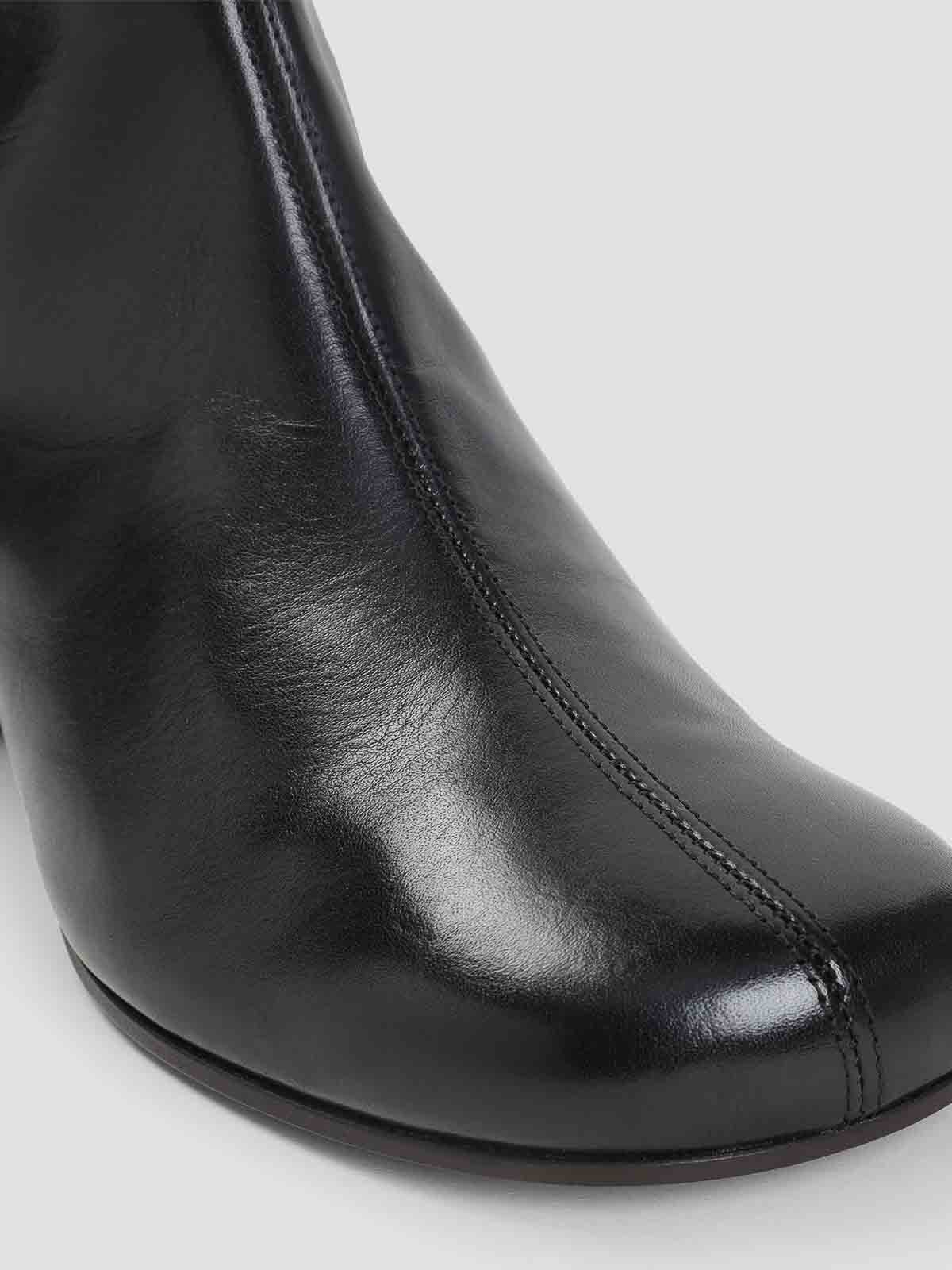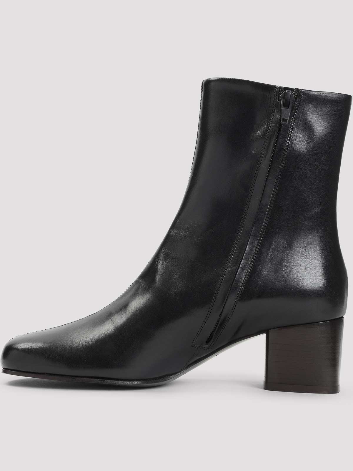 Lemaire アナトミックブラックブーツ。上部は起毛加工のブラック製で、足首までの長さの丸いつま先はジッパー付きで、内側と外側に四角いブロックが付いています。