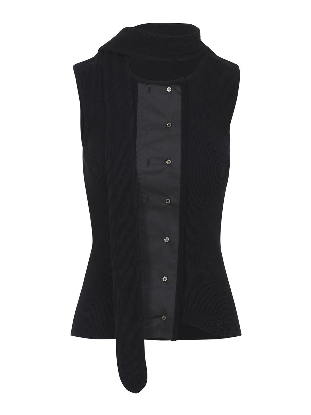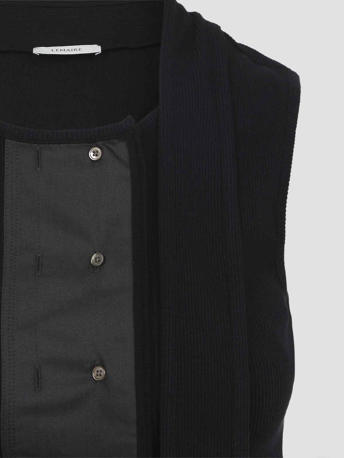 Lemaire ブラックコットンのアシンメトリーフィットトップ。コットン、リネン、エラステインのブレンドで作られています。スタンドアップスカーフの襟、ラウンドネック、フロントボタン留め、ノースリーブ、ストレートヘム、全面リブ編み。