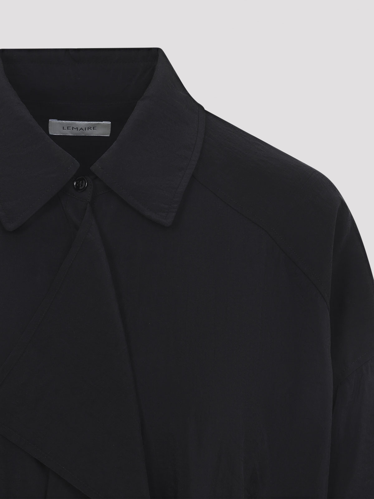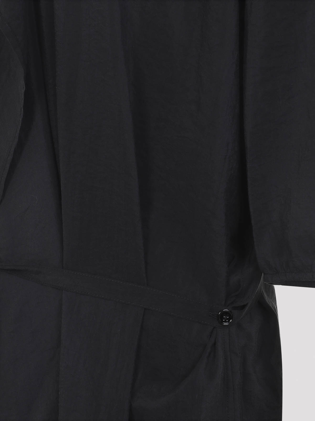 Lemaireのアシンメトリーなブラックシルクのミディドレス。ブラックシルク混紡素材で、先のとがった襟、隠しボタン留め、フロントフリルのディテール、ドロップショルダー、ショートスリーブ、ウエストの取り外し可能なセルフタイベルト、ミディ丈が特徴です。