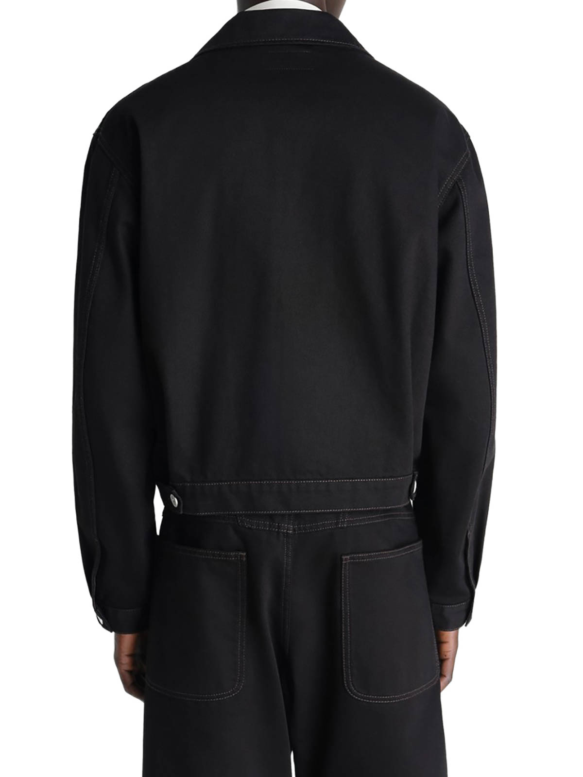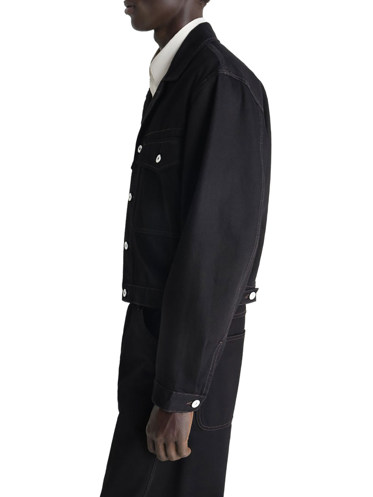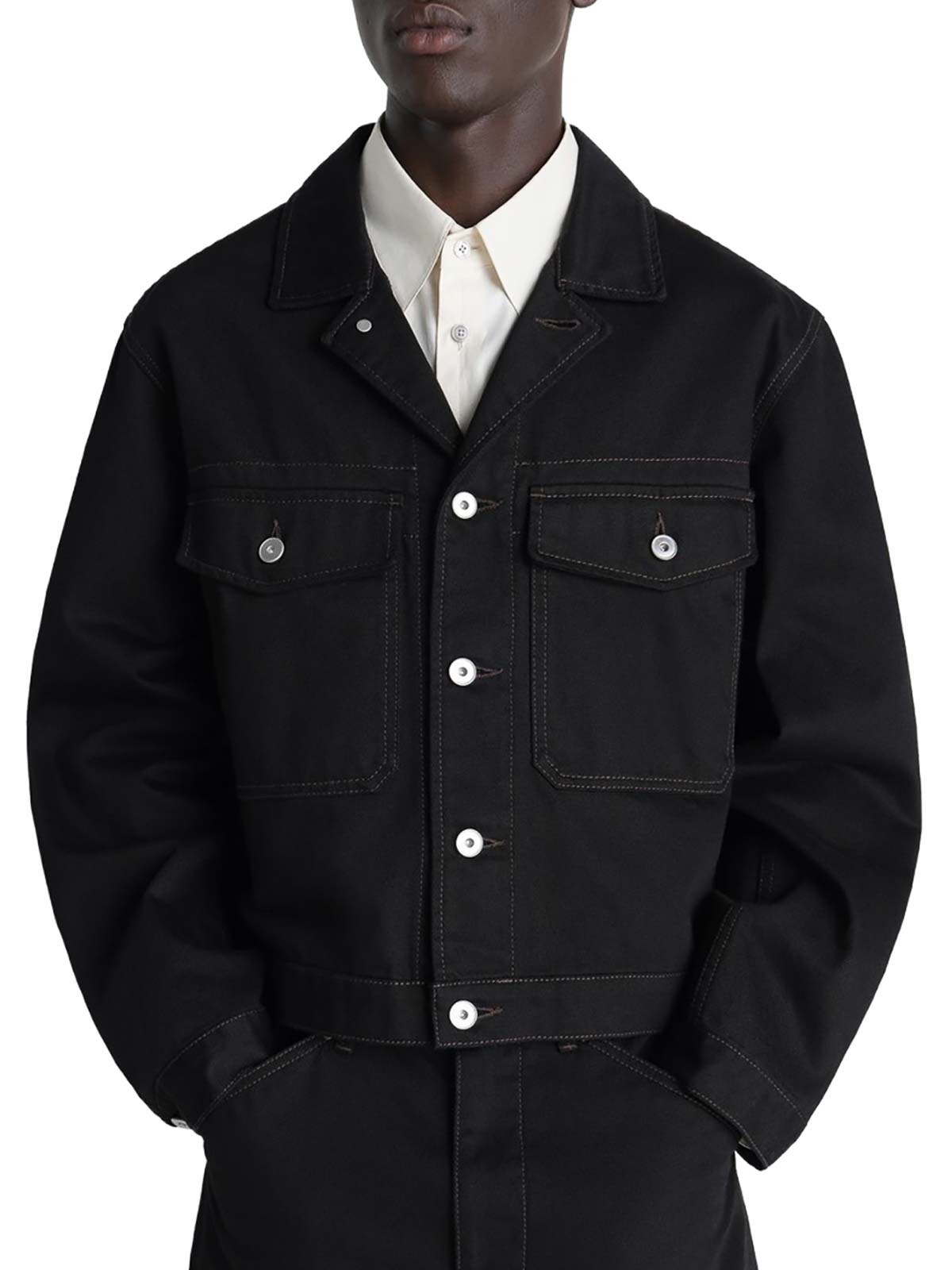 トラッカージャケット、ヘビーブラックデニム、ストレートフィット、シャツカラー、フロントボタン留め、ロングスリーブ、ストレートボタン付きカフス、フラップとボタン付きのパッチチェストポケット、調節可能なウエストタブ、装飾トリム付きのメタルボタン、コントラストステッチ、ルメール型押しレザーの内部ラベル、モデルの身長は187cm、サイズ48(m)を着用、色:黒