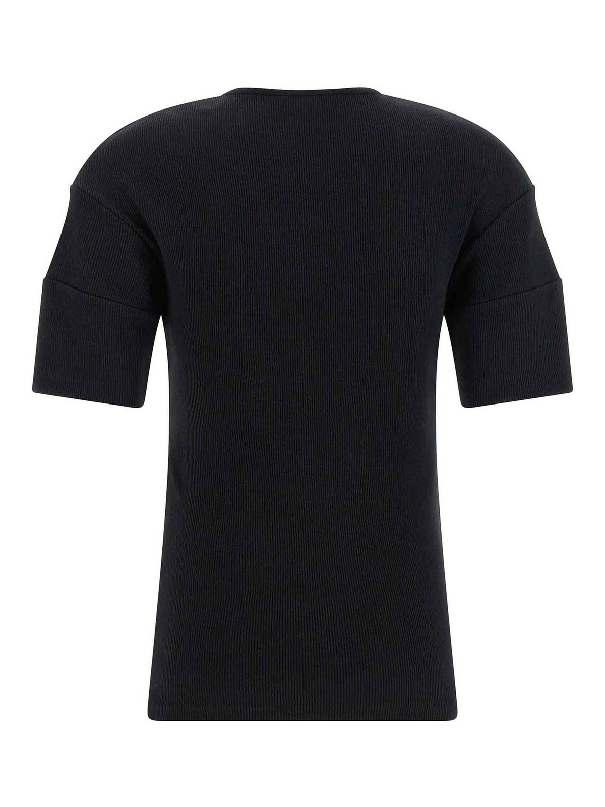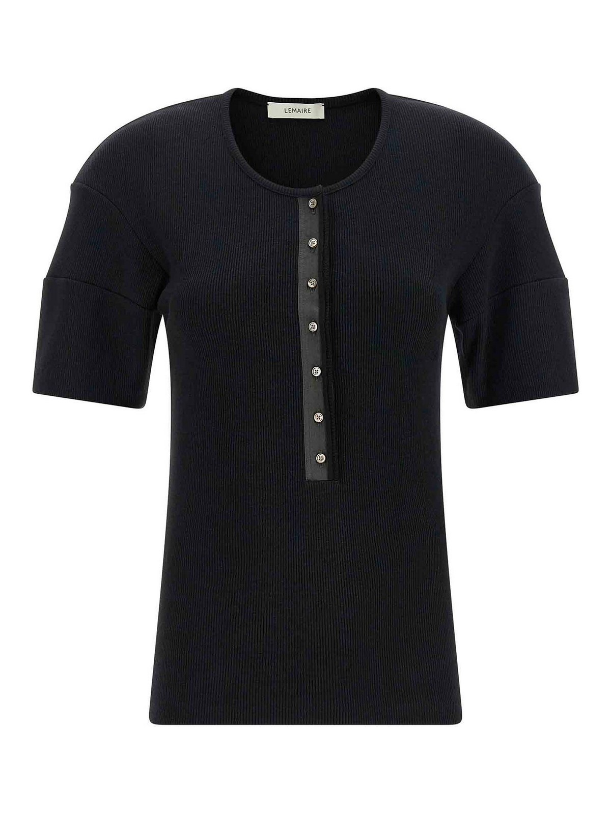 ヘンリーのリブ編みのコットンとリネンのジャージーセーター、マザーオブパールのボタン留めとフロントボタンにコントラストファブリックをあしらったラウンドネック、3D効果のあるプリーツをあしらったショートスリーブ。