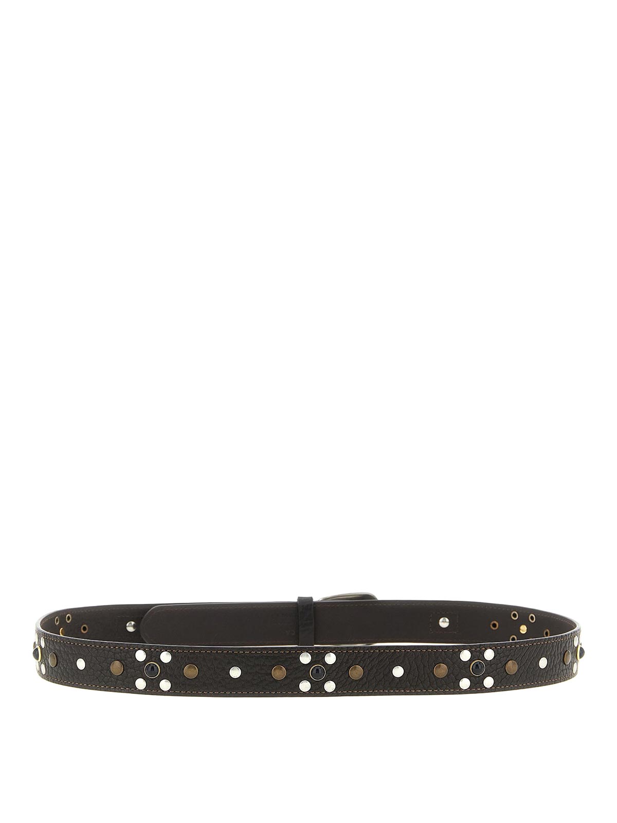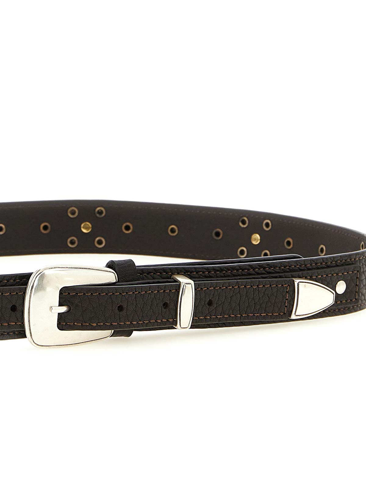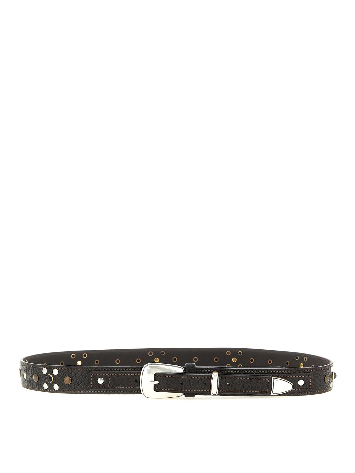金属製のスタッズとストーンのアップリケ、金属製のバックルとつま先が付いたウエスタンハンマードカウハイドレザーベルト。