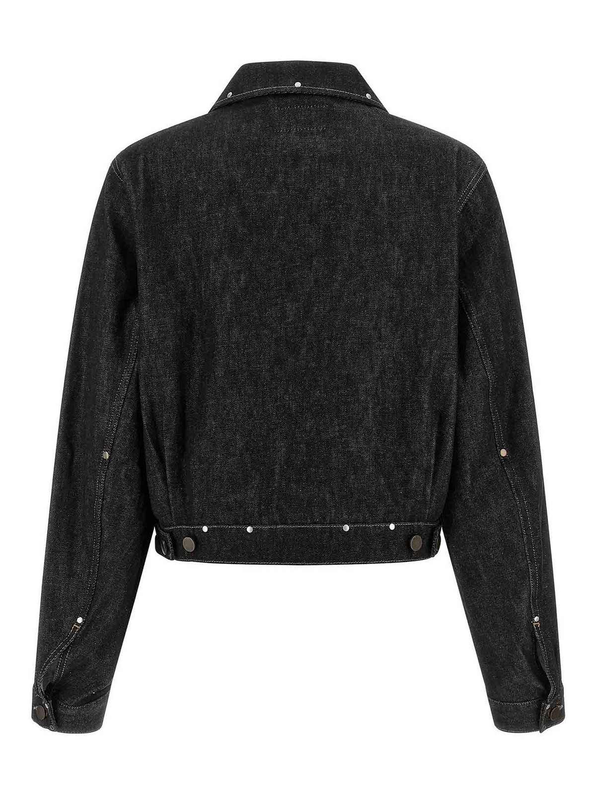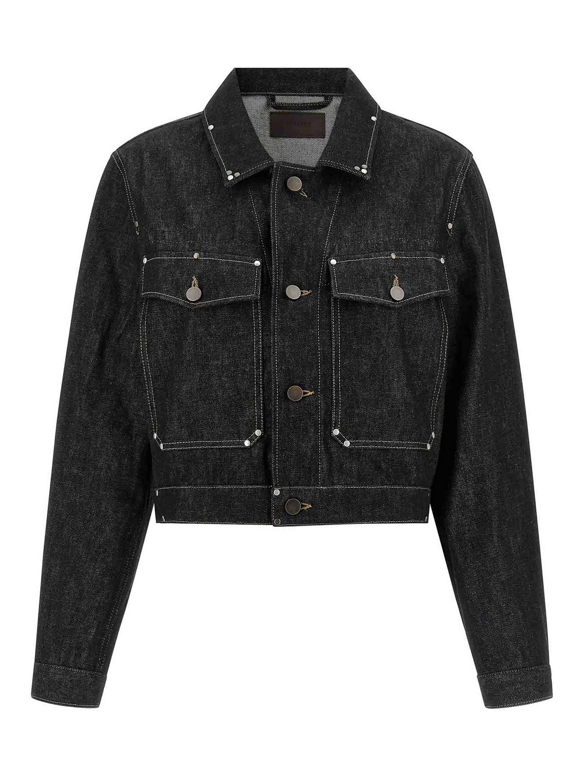 リベット付きヘビーデニムブルゾン、コントラストステッチ、クロップスタイル、シャツカラー、フロントボタンクロージャー、ポケット、袖口付き長袖、裏地なし。