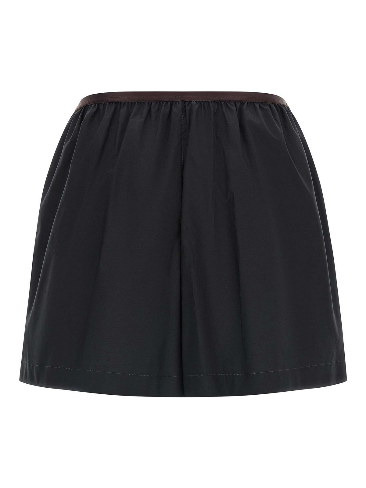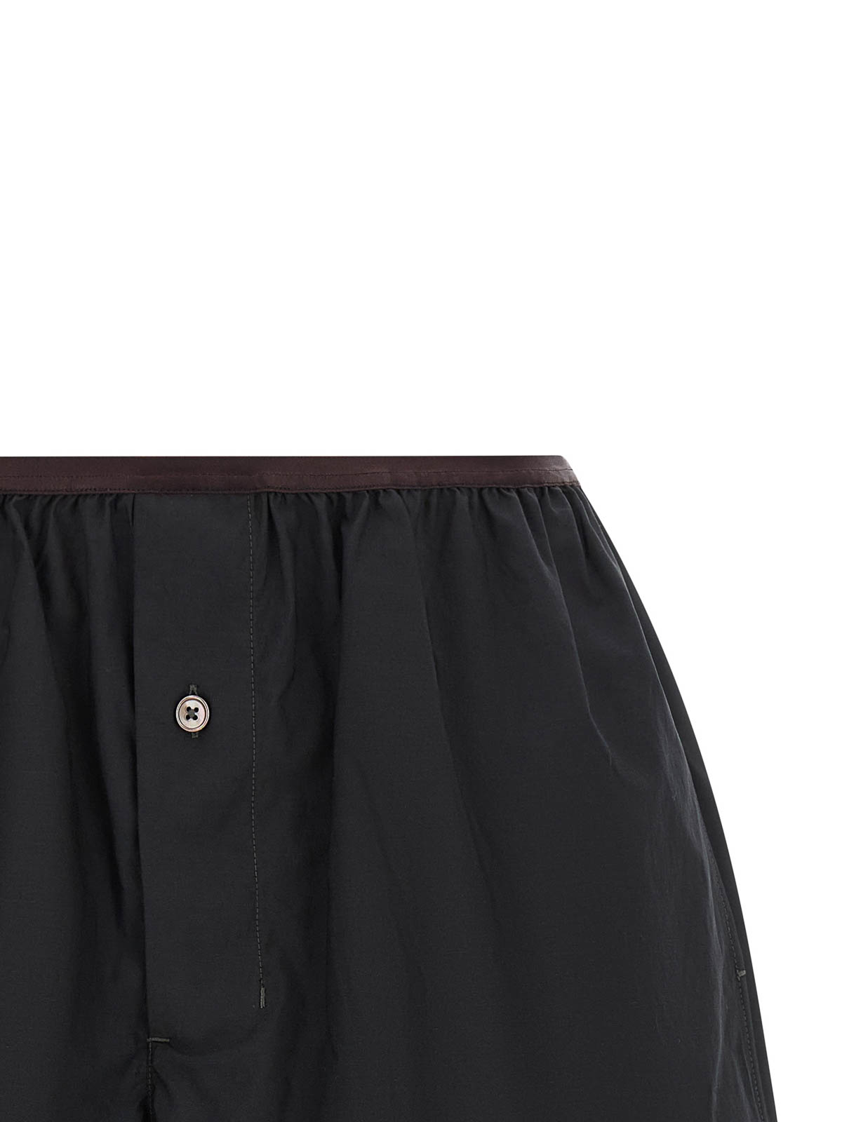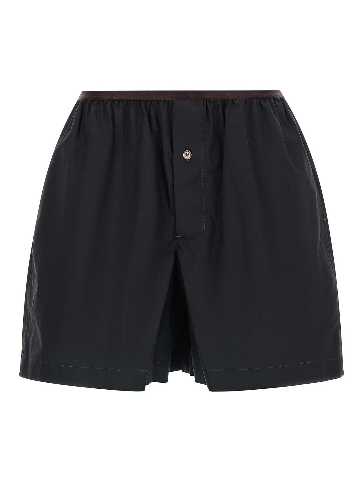 ややカールしたコントラストの効いた伸縮性のあるウエストバンド、フロントボタン、非常に幅の広いレッグ、サイドポケットが付いたボクサー用軽量コットンショーツ。