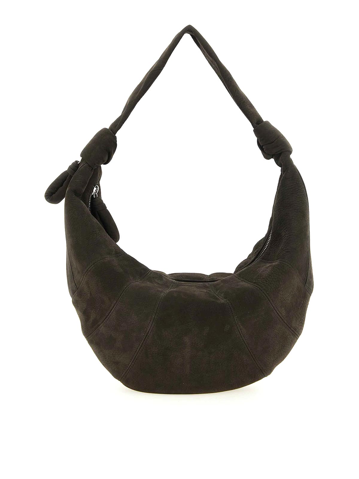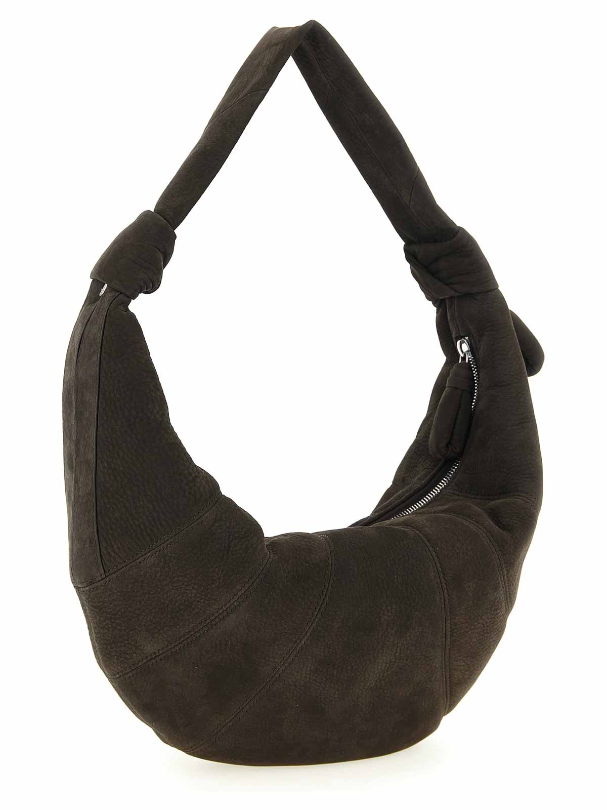 三日月形のシルエットが特徴のヌバックアルパカのフォーチュンクロワッサンショルダーバッグ。ステッチパネル構造、コットンキャンバスの裏地、上部にファスナー開閉、結び目のディテールが施された固定ハンドル。