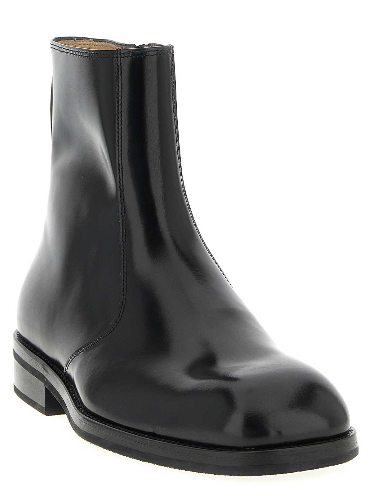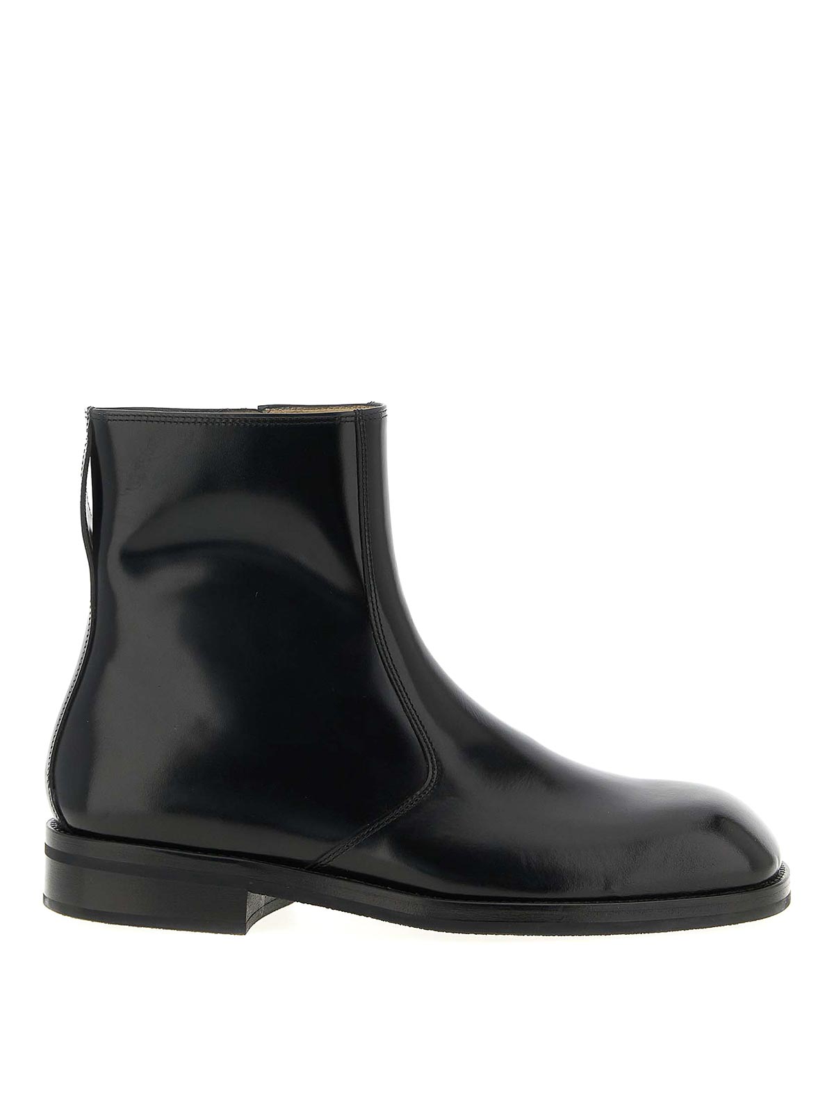 滑らかで光沢のある外観のLWGシルバー認定カーフレザー製アンクルブーツ、細長いスクエアトウ、サイドジッパー、レザーソール。