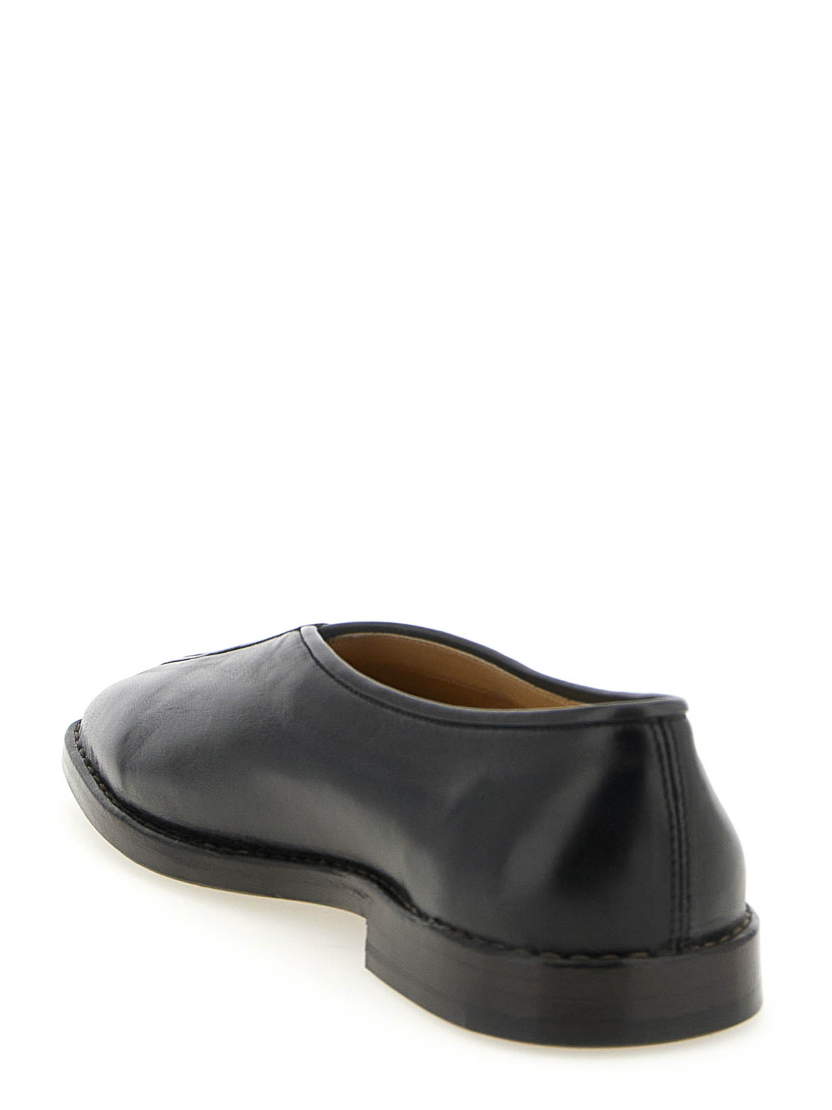 LWGゴールド認定のラムナッパレザーのフラットパイプスリッパースリッポン生地。前面に2枚のレザーを縫い合わせ、レザートリム、細長いスクエアトウ、レザーソールで密閉しています。カラー:とてもダークブラウン
