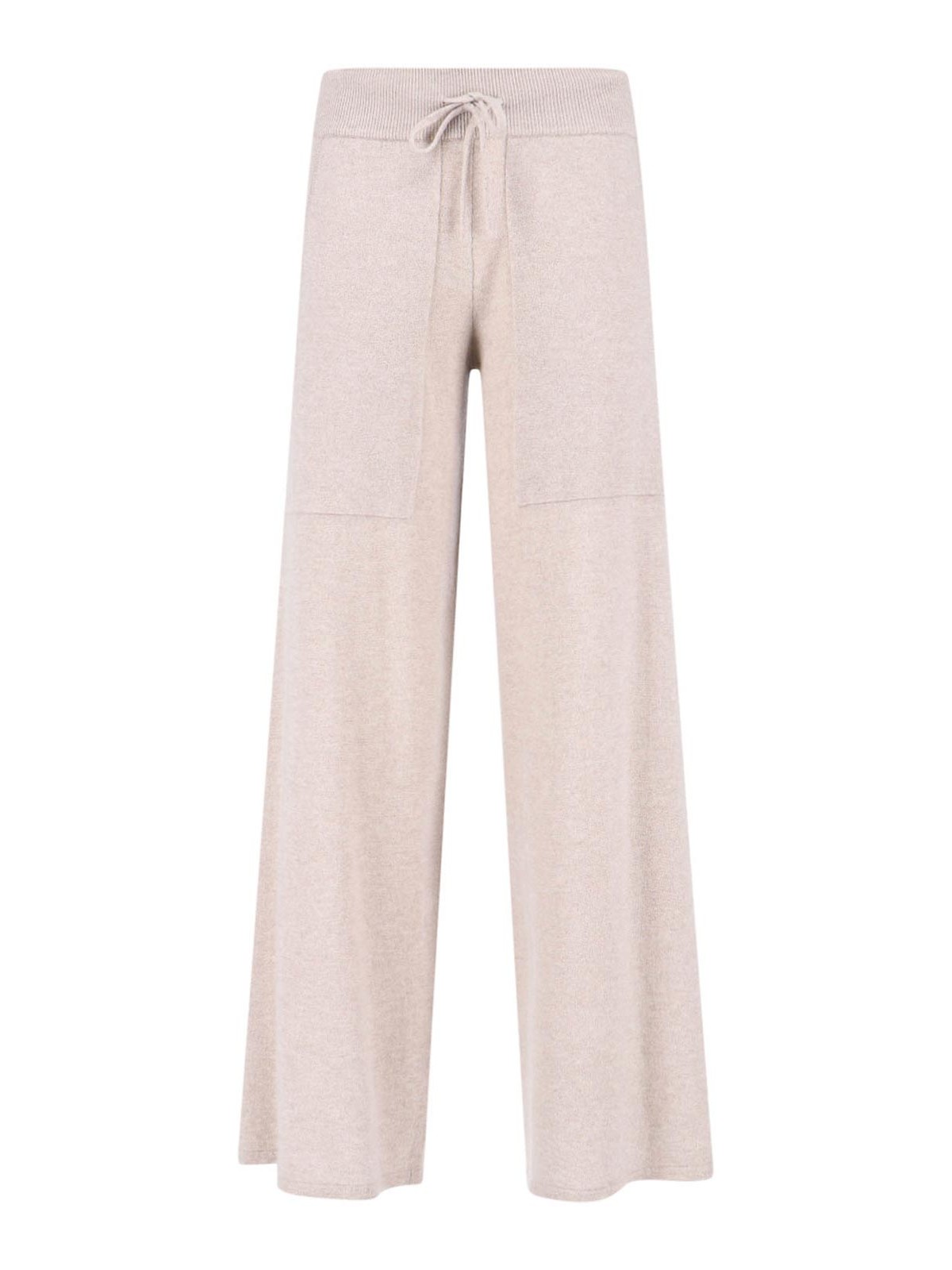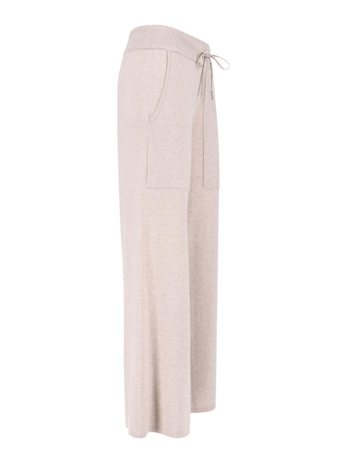 リサヤンカシミアスポーツパンツ、ベージュ、伸縮性のあるミッドウエスト、ドローストリングクロージャー、サイドポケット2つ、ストレートレッグ。