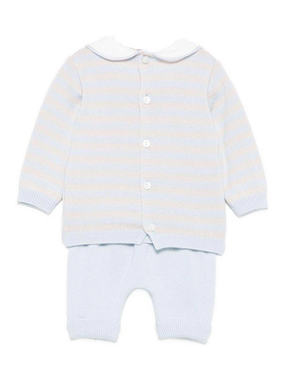 ボタン、襟、長袖、リブ仕上げのライトブルーのストライプスーツが特徴です
