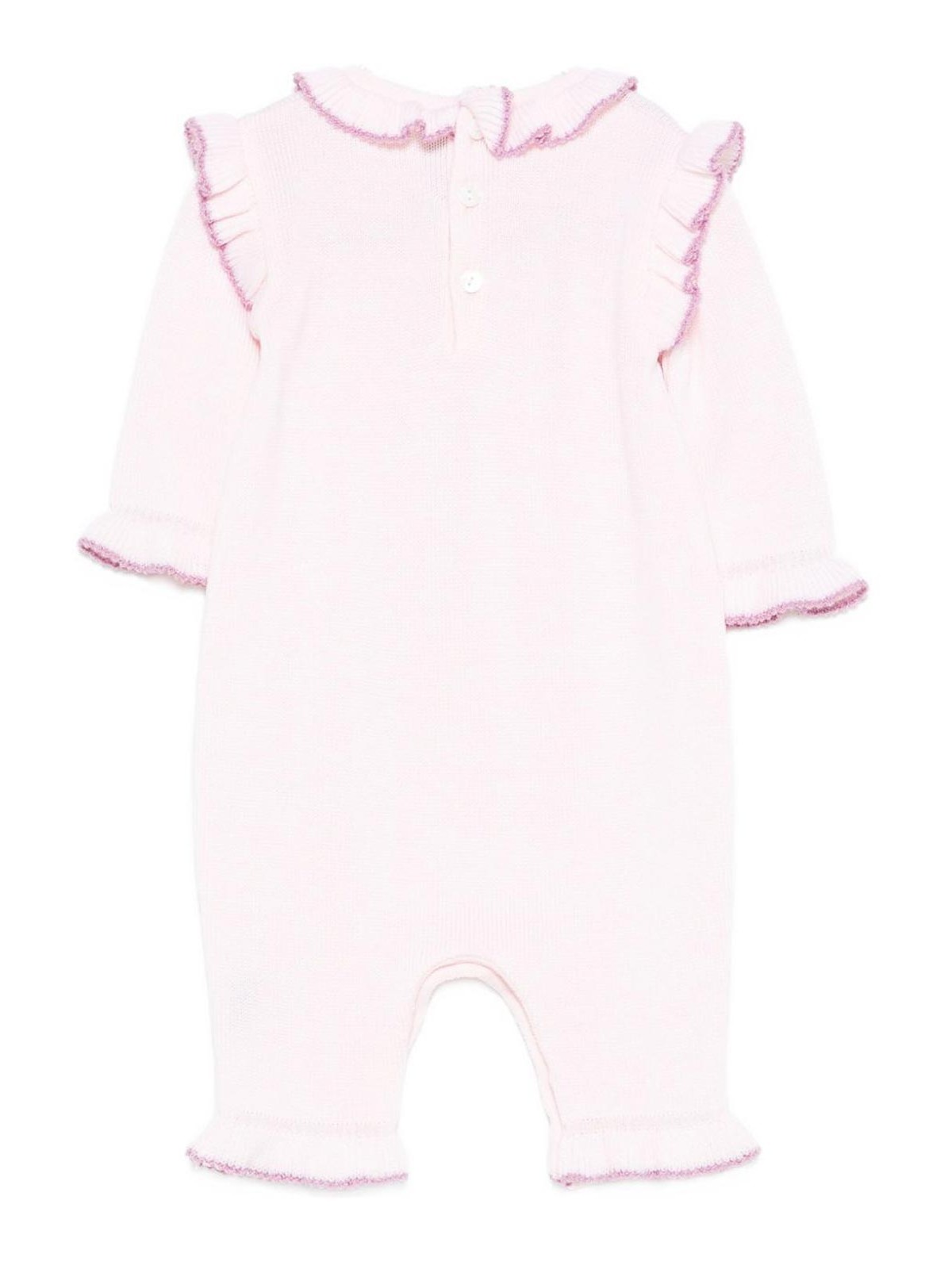 フリルのプレイスーツは、ピンクの長袖クルーネック、後ろにボタンが付いています。