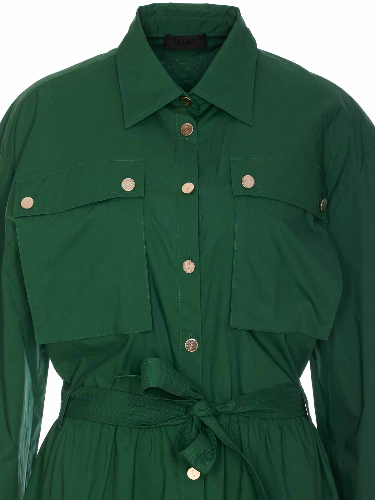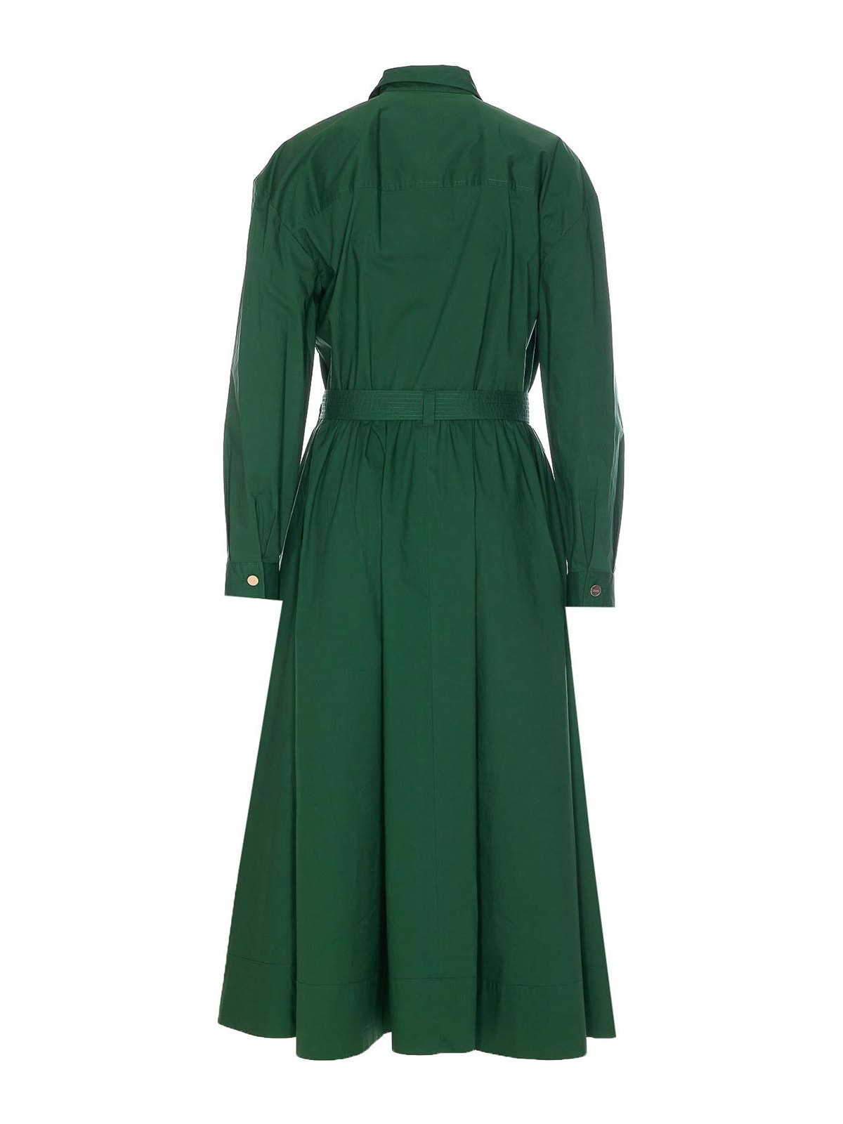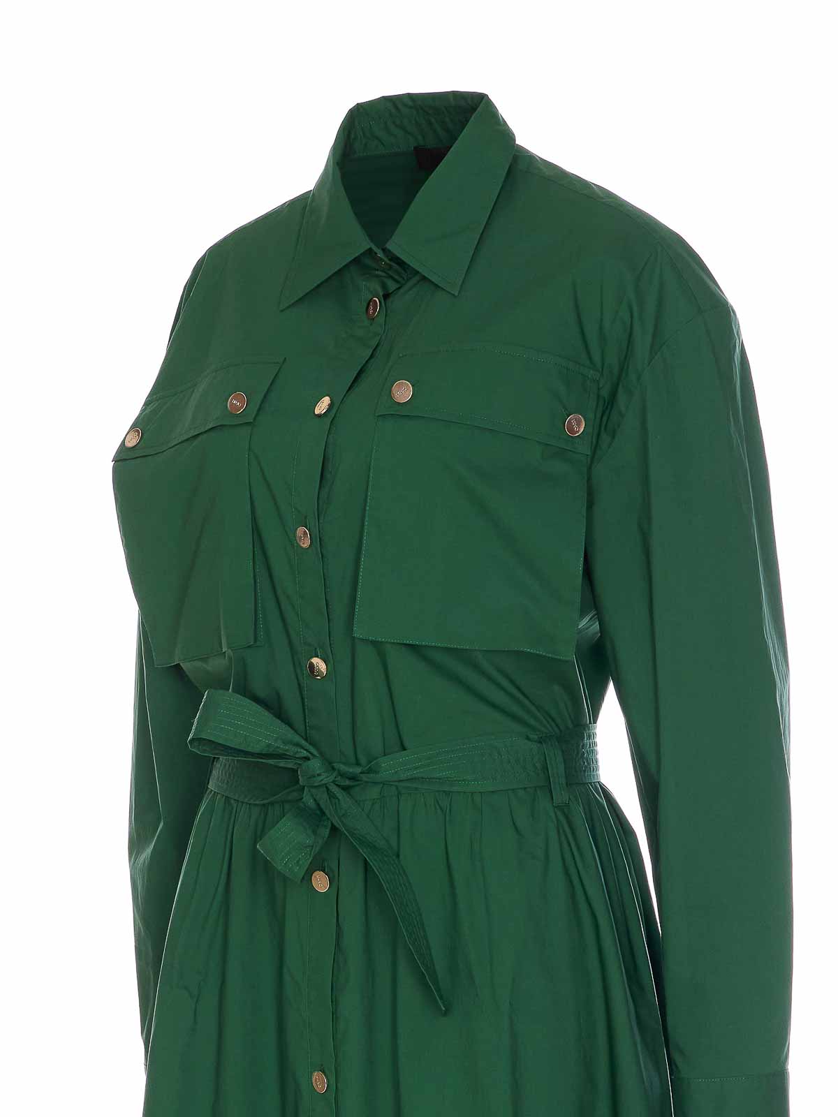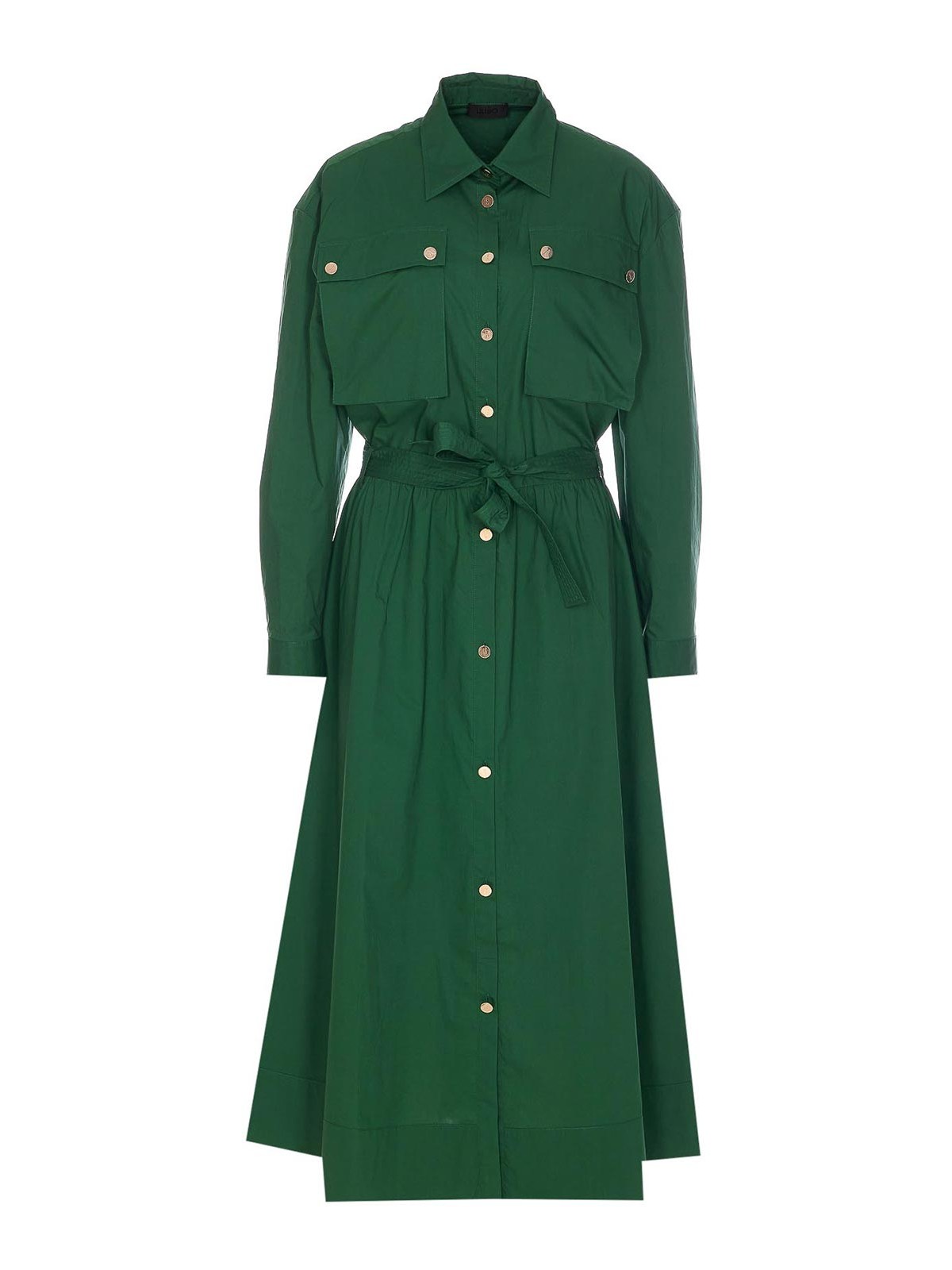 グリーンドレス、レギュラーカラー、ボタン、ウエストにポケット、ベルト、長袖、袖口にボタン