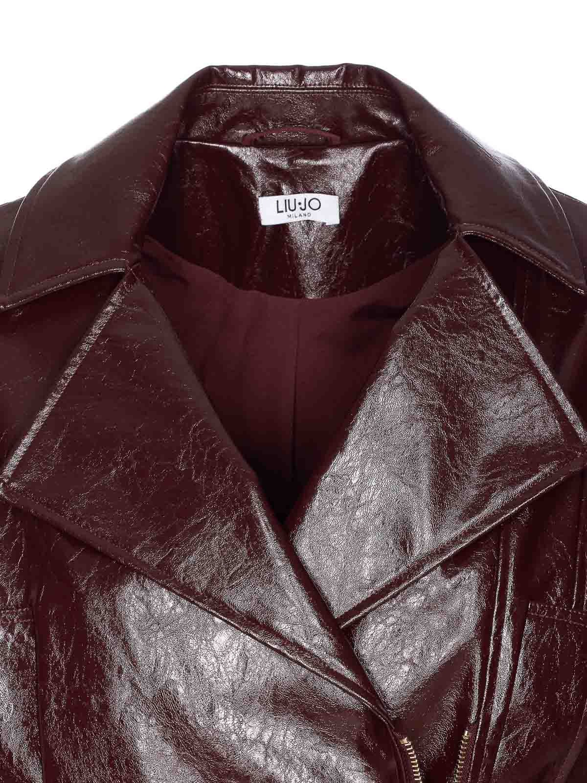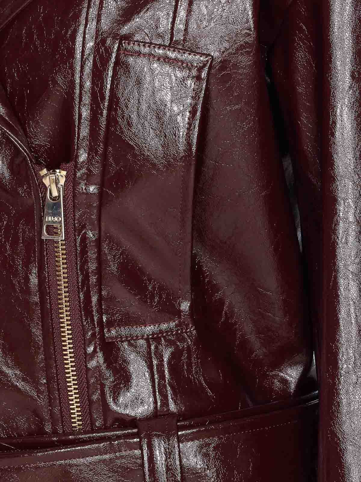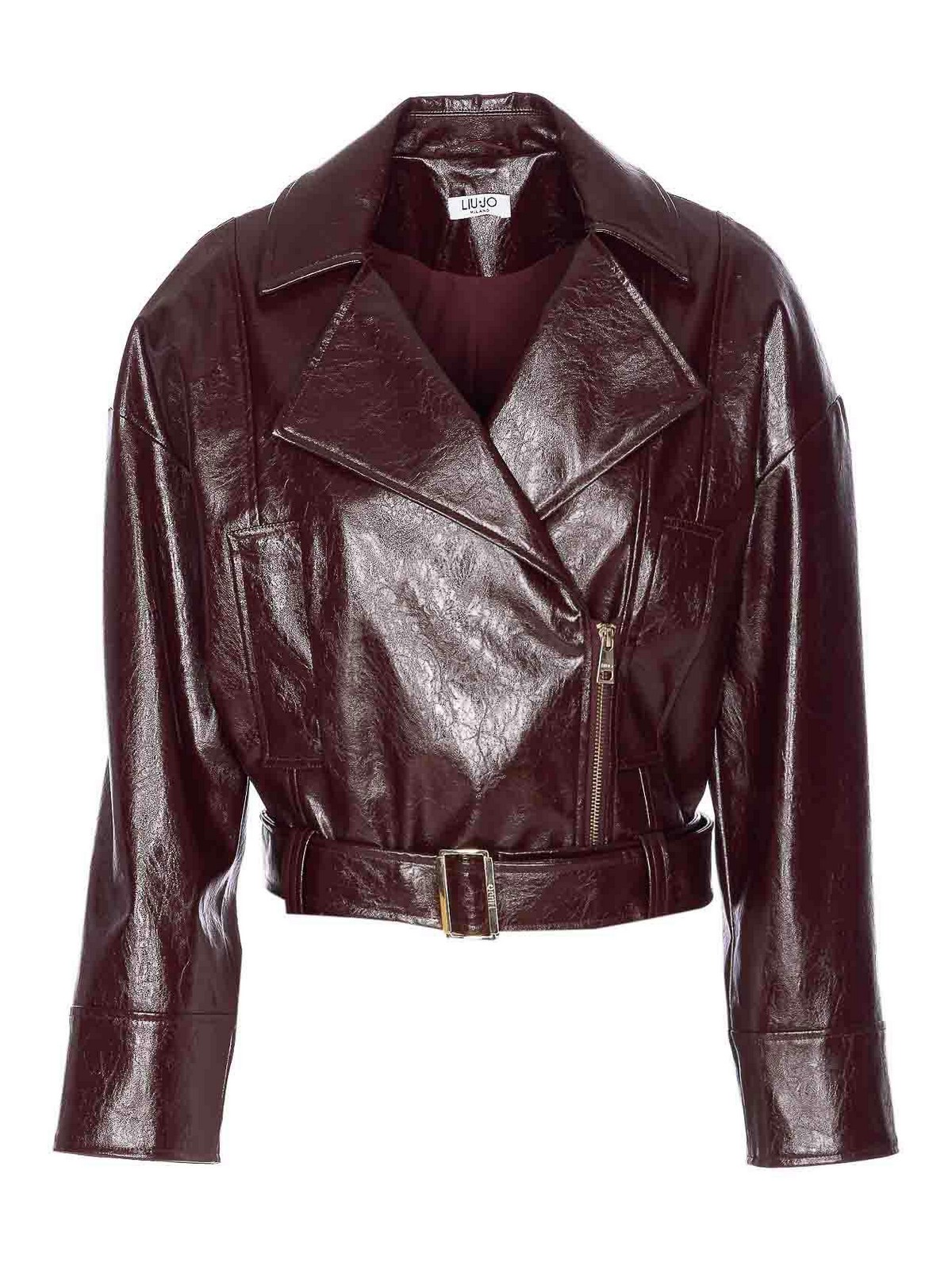 Liu jo ボルドービニールエフェクトジャケット、前面ファスナー付き、ウエストにベルト、長袖、ポケット付き