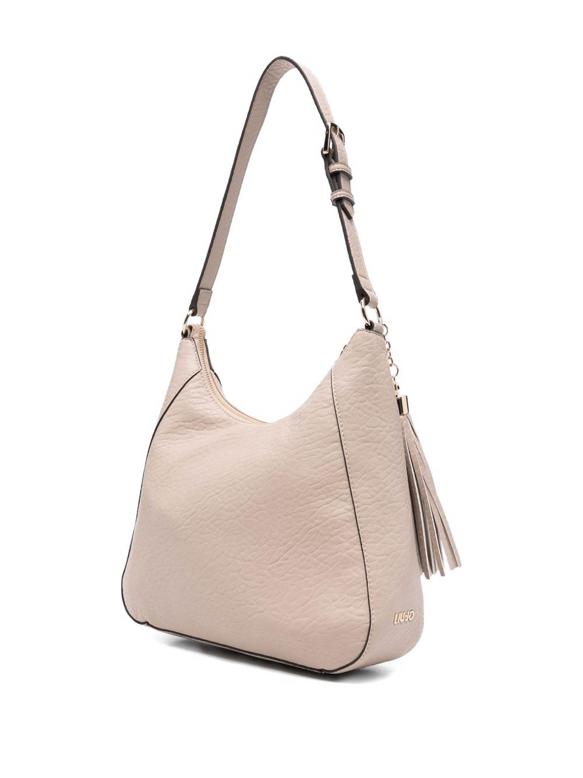 ベージュエンボス加工ロゴタッセルジップショルダーストラップシングルコンパートメント