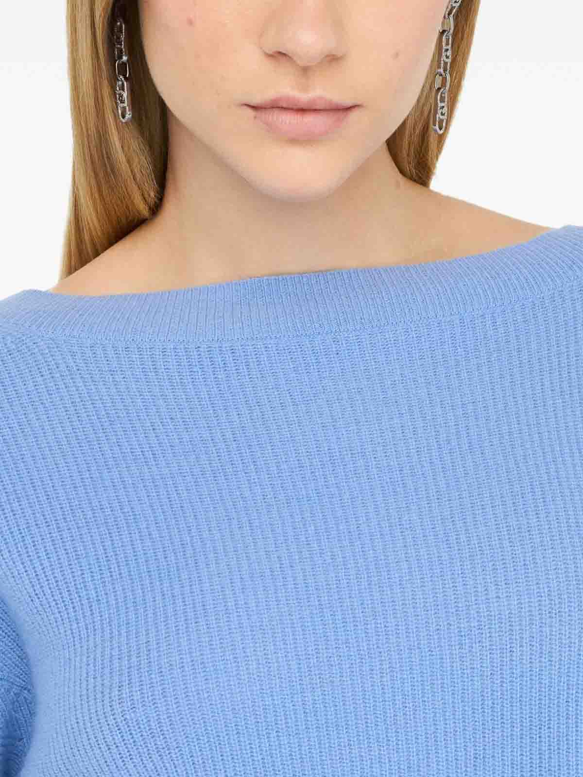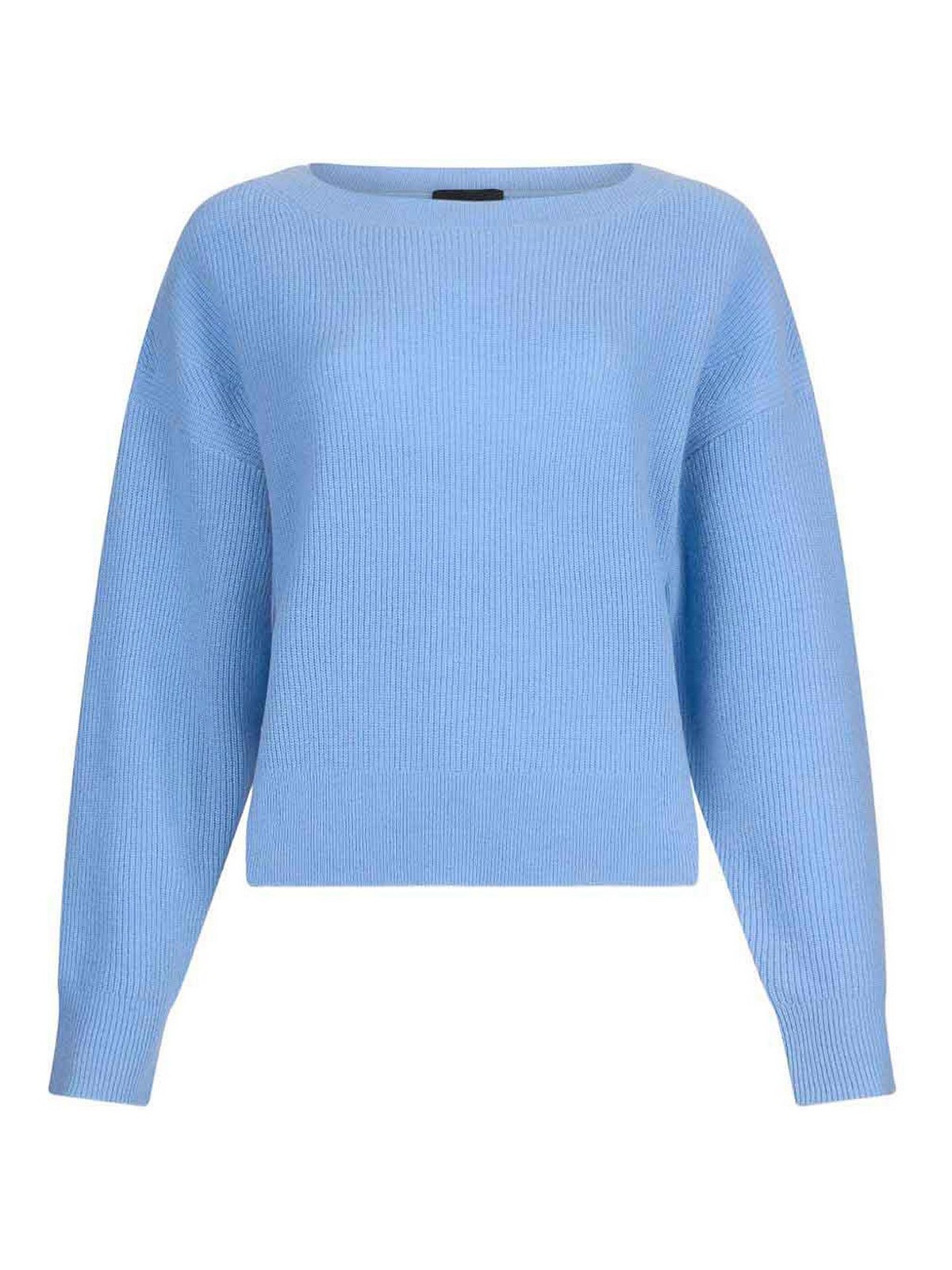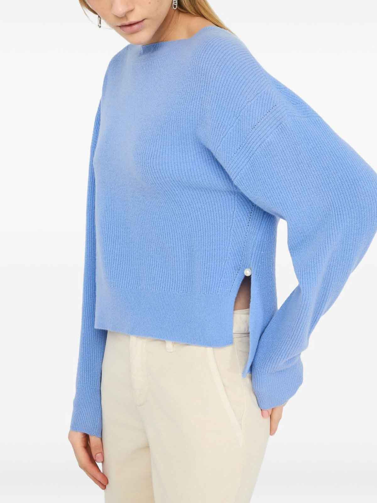 ライトブルーのリブニット、ボートネックライン、ロングスリーブ、サイドスリットが特徴