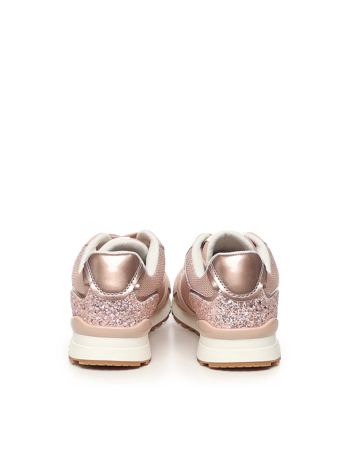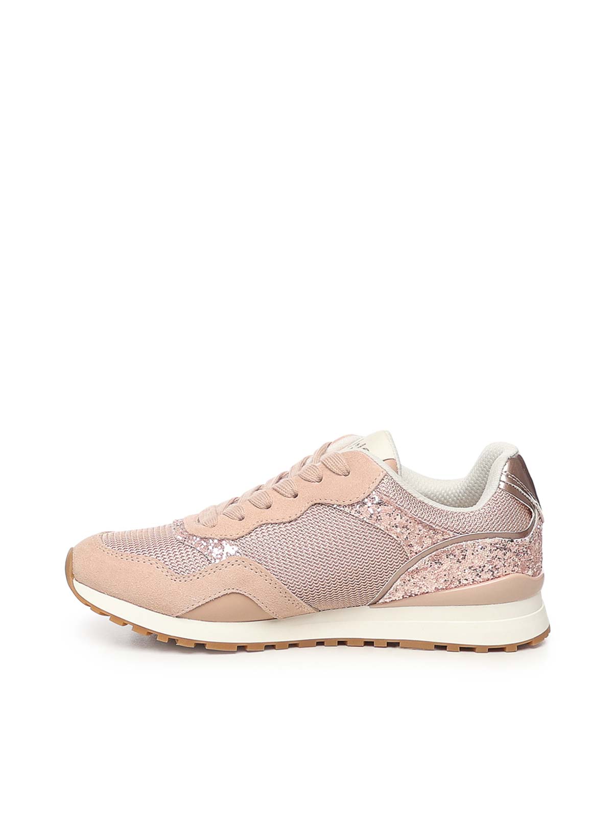 グリッターとメッシュのアッパー、レースアップフロント、スエードインサートと光沢のあるパテントレザーのディテール、フラットレース、多層ソール、色:ピンク