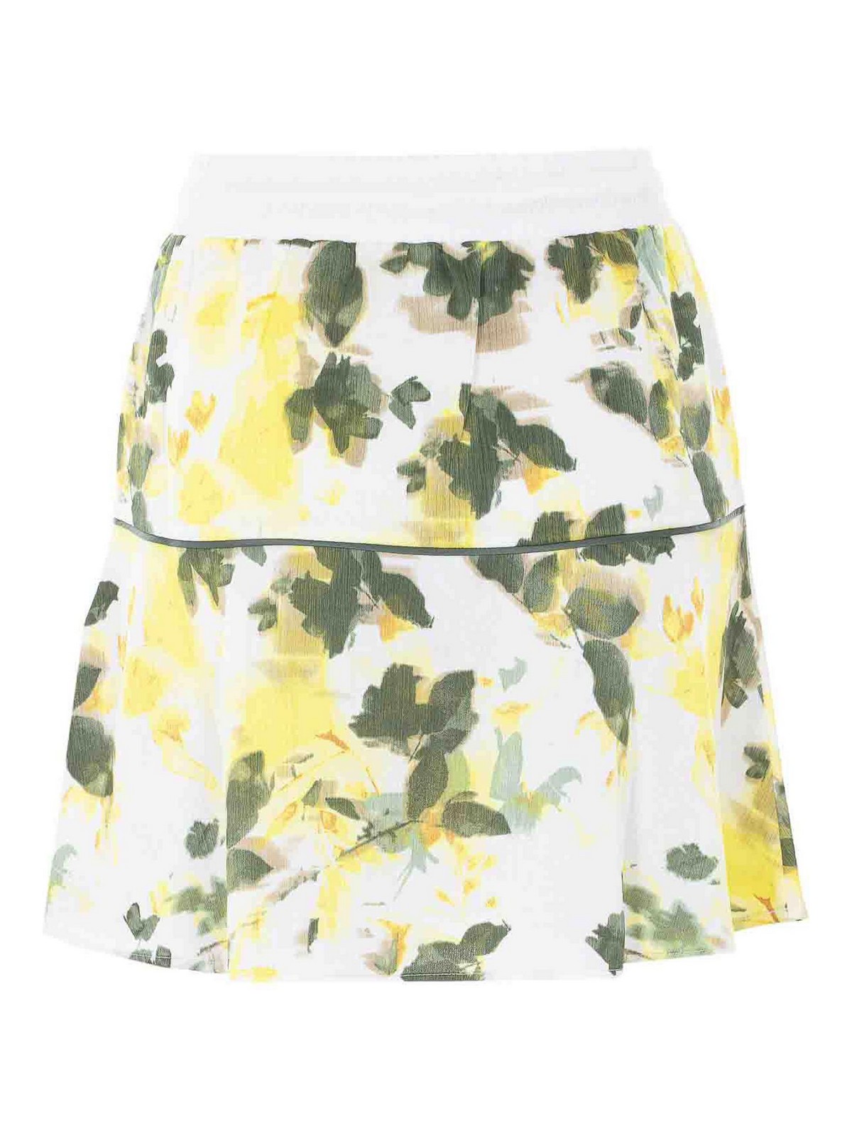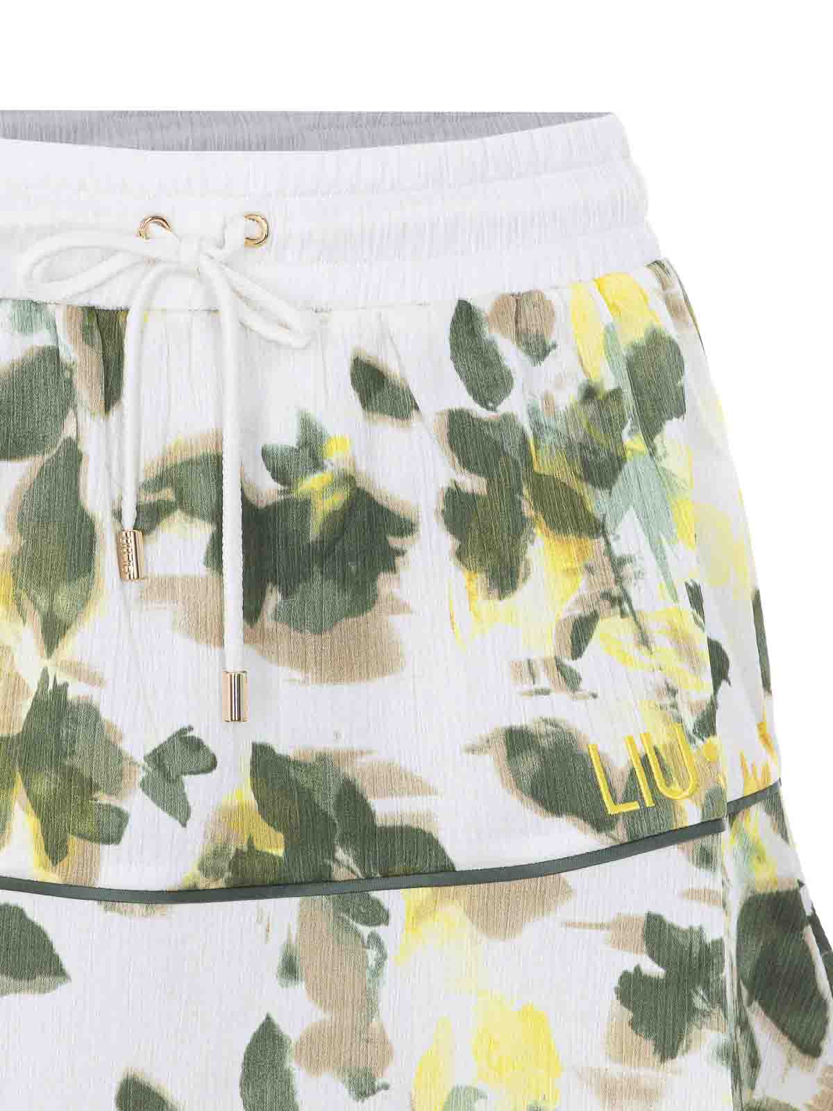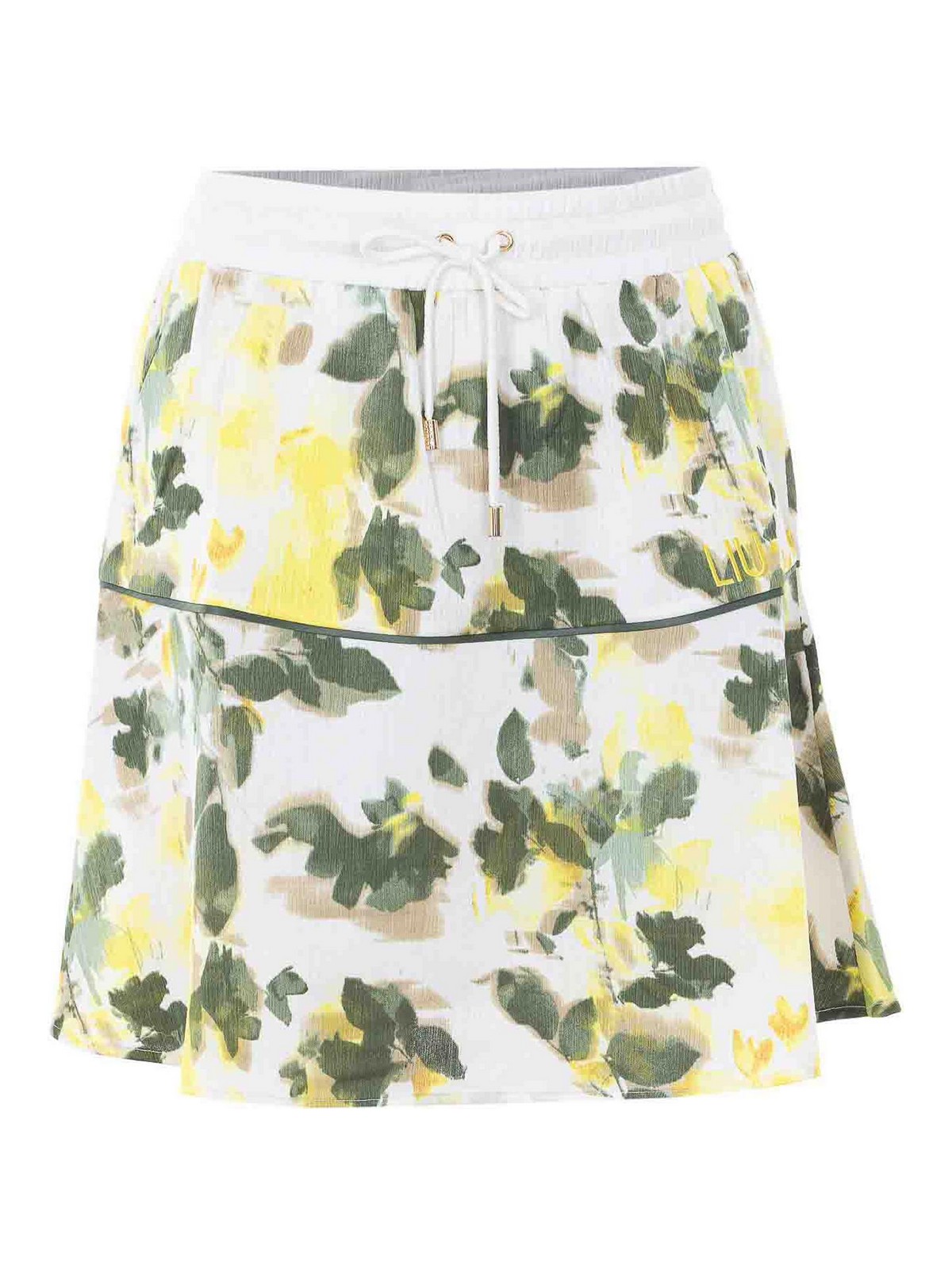 リウジョーグリーンシェードスカート、ミニモード、ドローストリングクロージャー、花柄、正面刺繍ロゴ