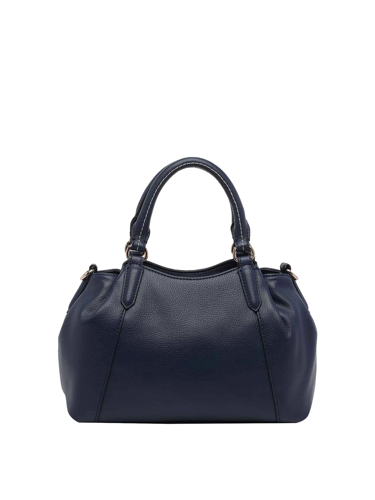 リュウジョーブルーハンドバッグ、前面にロゴ、ファスナー開閉、オープンポケット、ハンドル2つ、取り外し可能で調節可能なショルダー