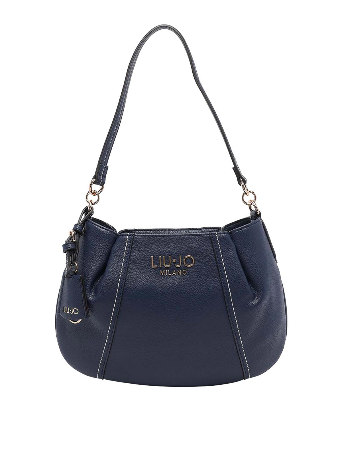 Liu Jo ネイビーロゴショルダーバッグ、ファスナー開閉、ファスナー付き内ポケット、オープンポケット、ショルダーストラップ、調節可能で取り外し可能なストラップ、正面ロゴ