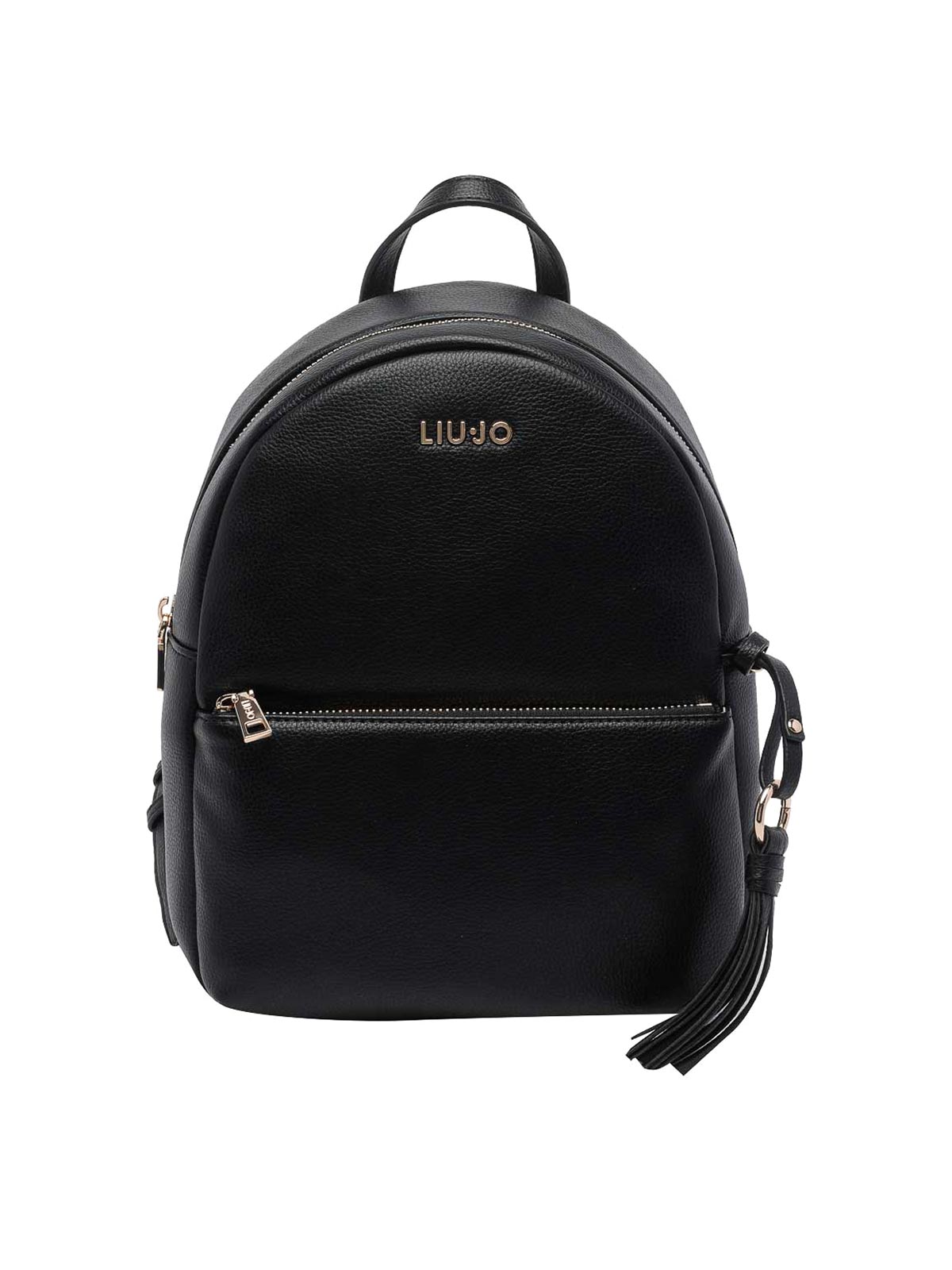 Liu jo ブラックロゴバックパック、ファスナー開閉、ファスナー付き内ポケット、ハンドル1つ、調節可能ストラップ、正面ロゴ