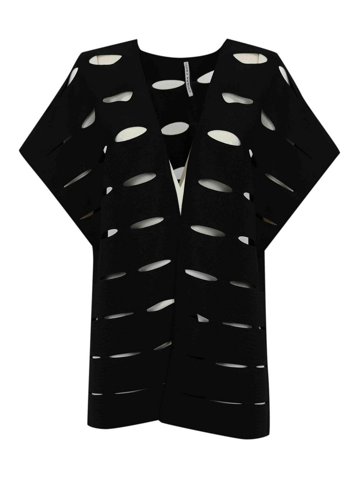 女性用カーディガンストレッチシャツ穴あきデザイン vis, a, vis, vis ショールネックラインドロップアームホールストレートヘムオーバーサイズフィットデザイナーカラー名:ブラック