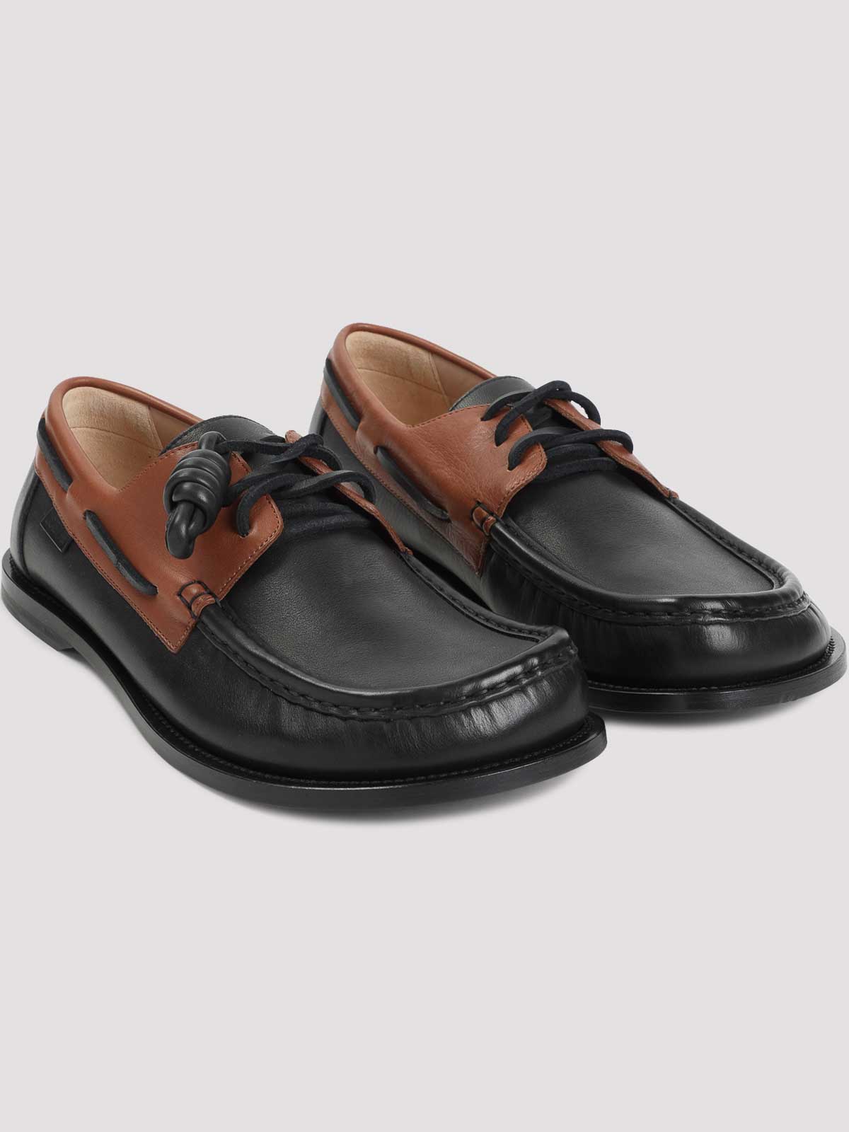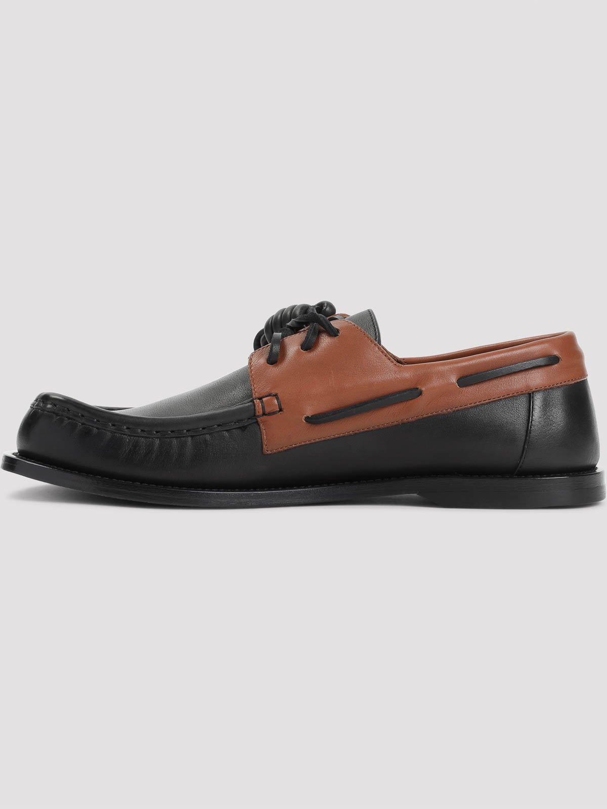 ロエベダークキャラメルカーフスキンカンポボートローファー。ピュアカーフスキンシューズ、ラウンドトウ、エンボスステッチ、トップブラックレースアップファスナー、アッパーにダークキャラメルのディテール、サイドブラックストラップ、トーナルソール。