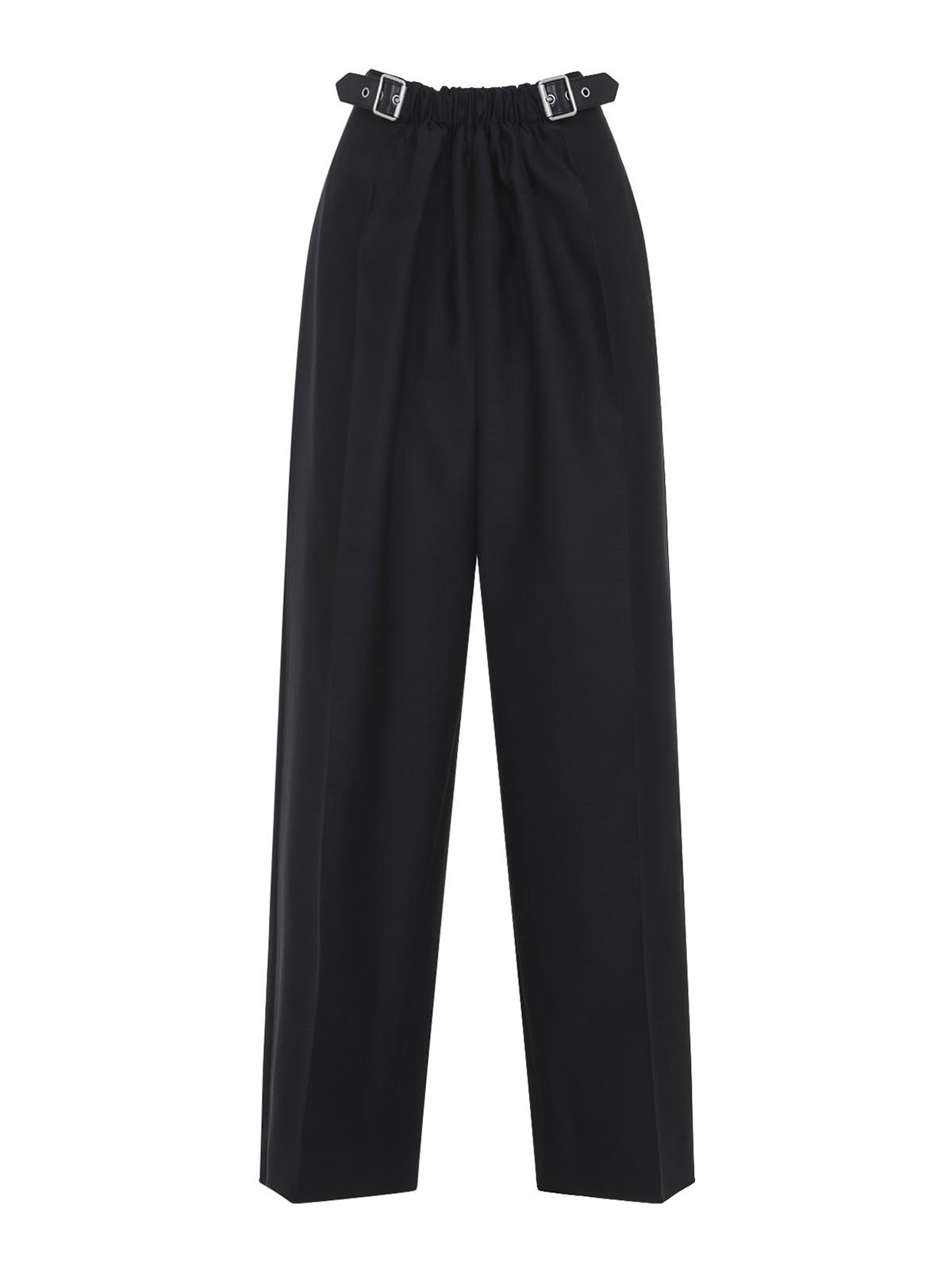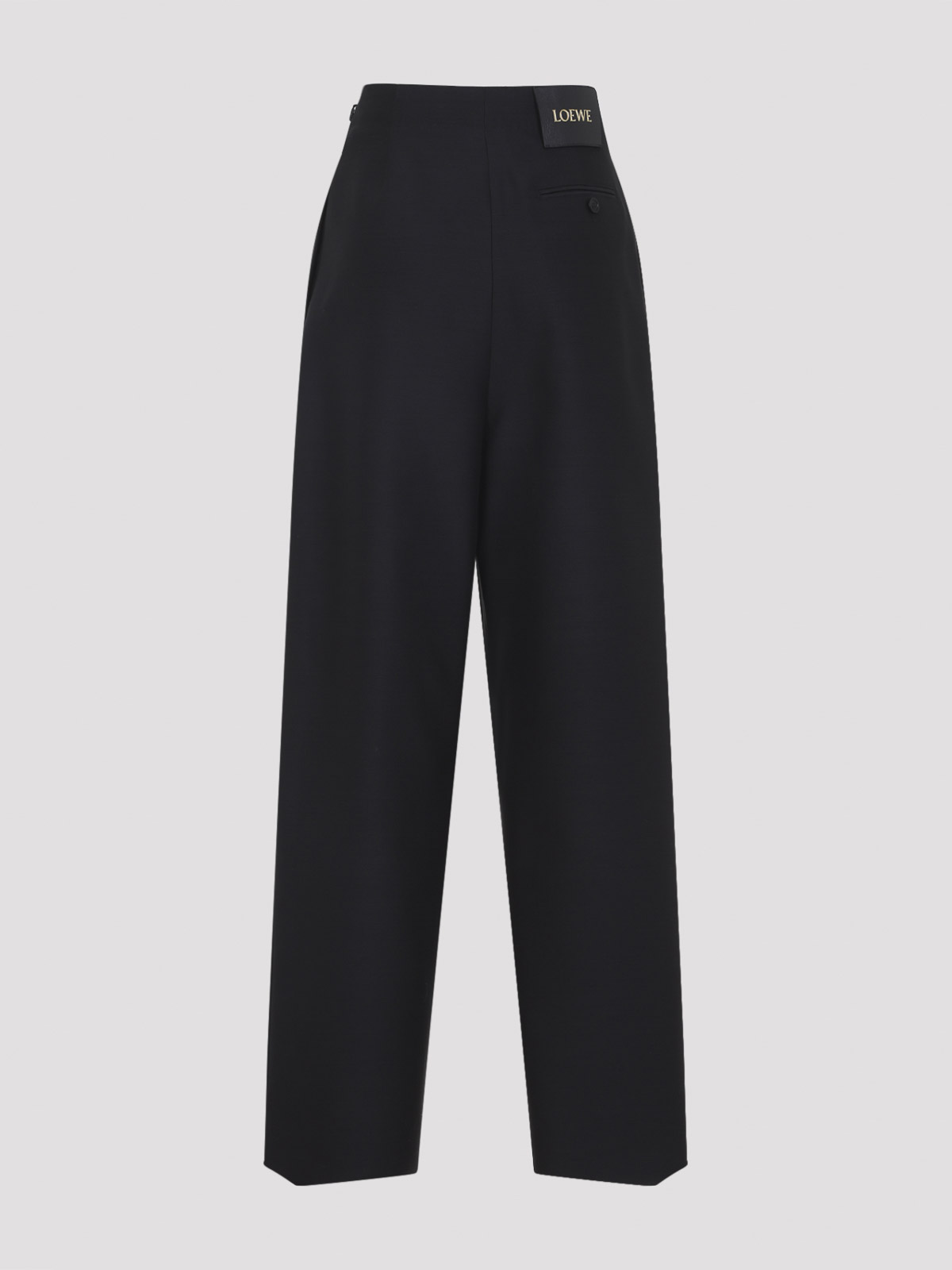 ロエベのベルト付きブラックウールとシルクトラウザーズ。ブラックウールとシルクで作られたミッドウエストパンツ。2つのレザーベルトのディテールをあしらったギャザーフロント、隠しサイドファスナー、インシームサイドポケット、バックウェルトポケット、ウエストの後ろにブランドレザーラベル、中央にプレス加工を施したクリース、ストレートレッグが特徴です。