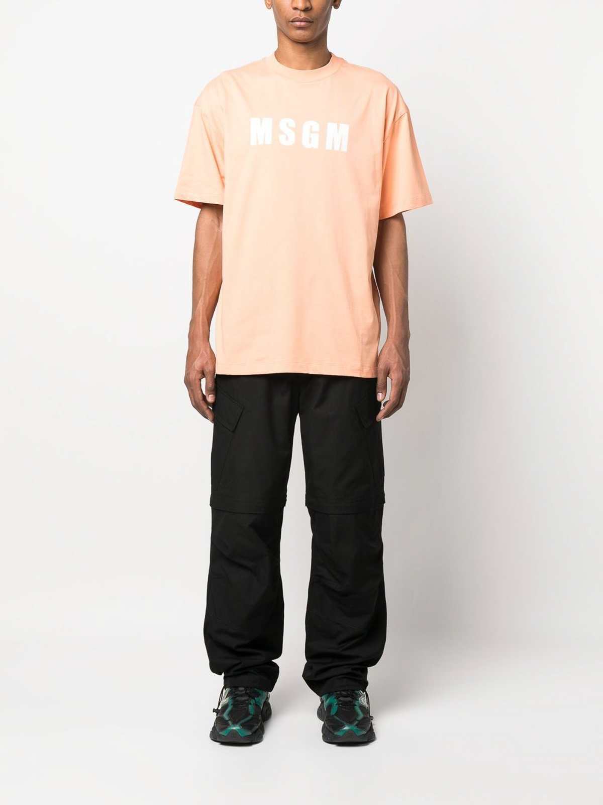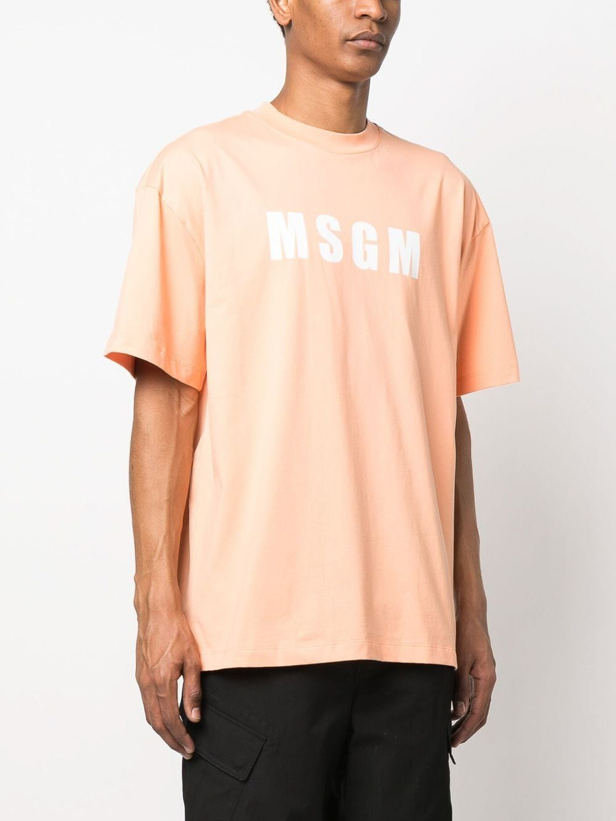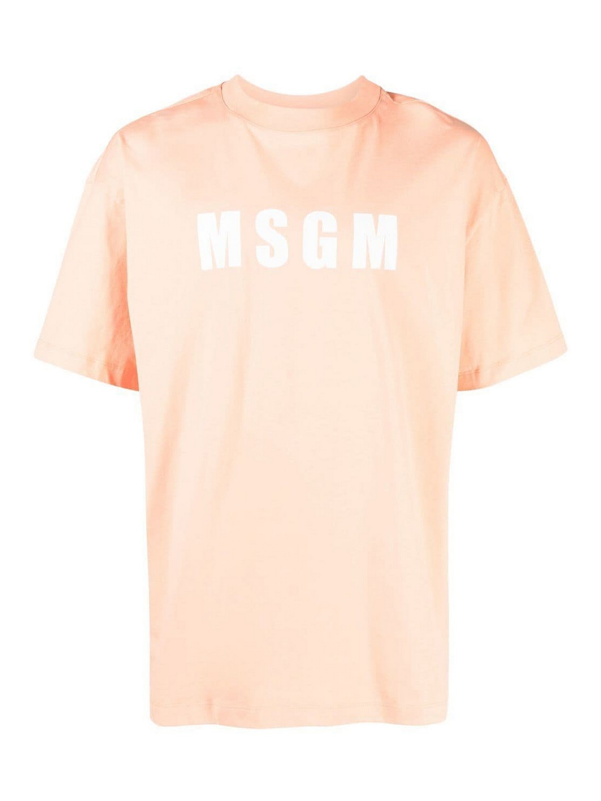 msgmのロゴプリント半袖Tシャツは、ゼラニウムオレンジ、コットン、ジャージーニット、フロントにロゴプリント、ラウンドネック、半袖、ストレートヘムが特徴です。