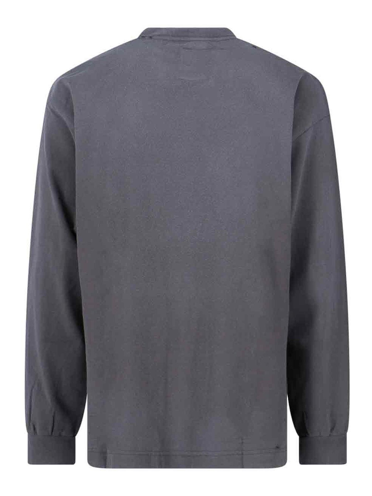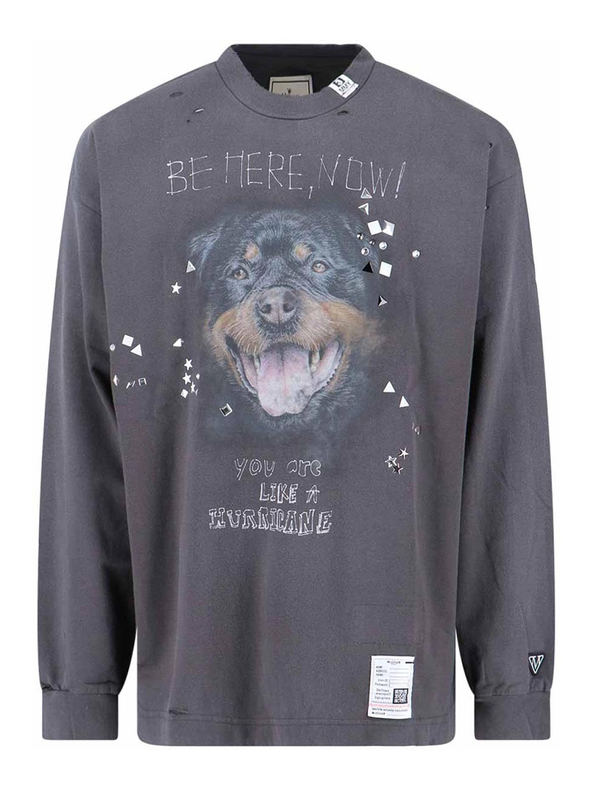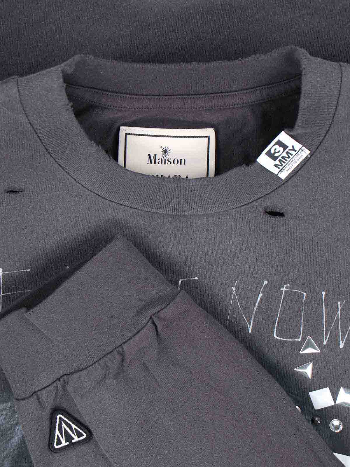 Maison Mihara YasuhiroのスタッズをあしらったロゴTシャツ、グレーのコットンジャージ、ウォールドエフェクト、デストロイディテール、クルーネック、フロントにマキシプリント、フロントに2つのロゴパッチ、リブ仕上げ、ストレートヘム。